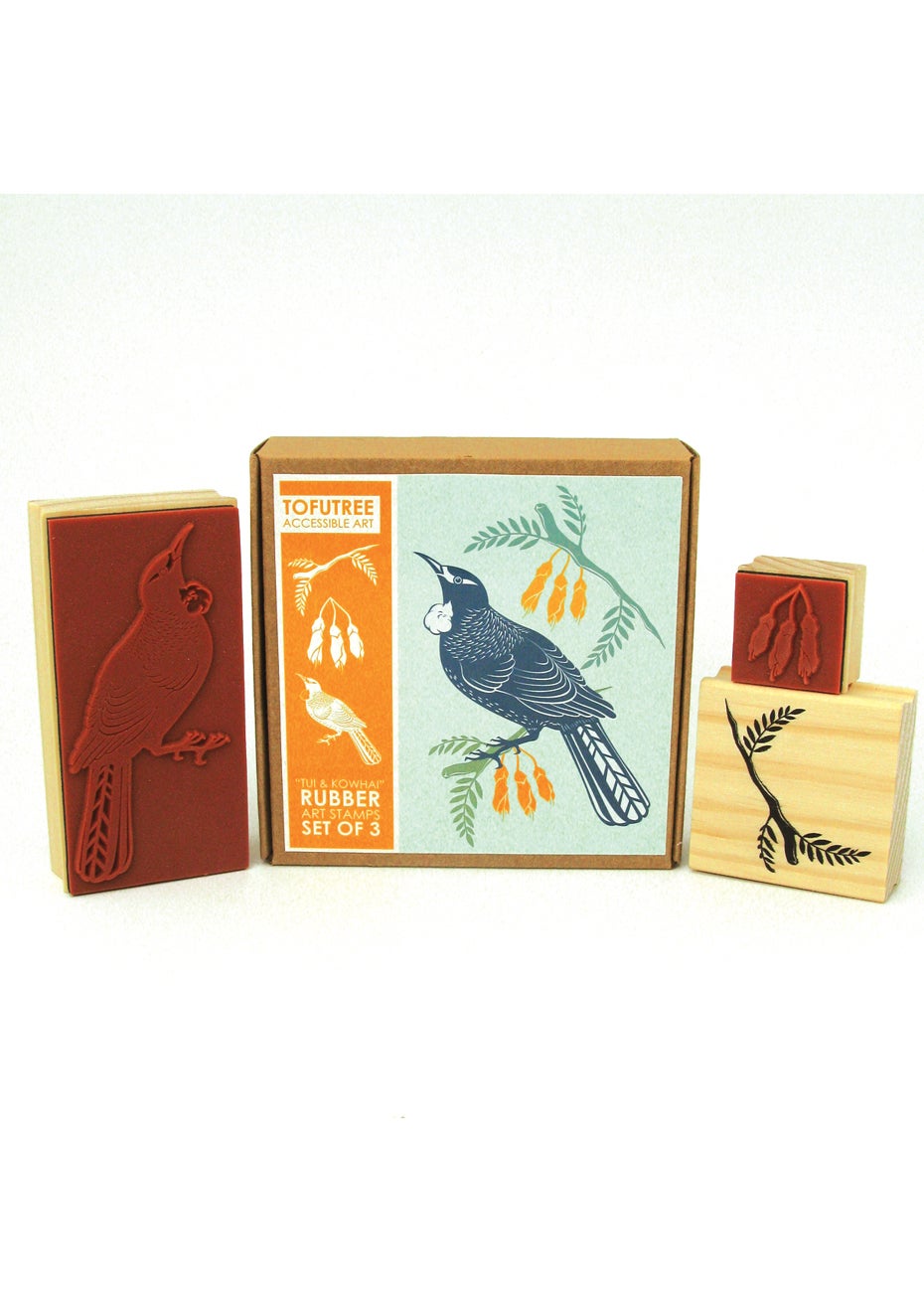 Set of 3 rubber stamps (Tui, branch and Kowhai flower) with thick cushion, each mounted on a pine block.