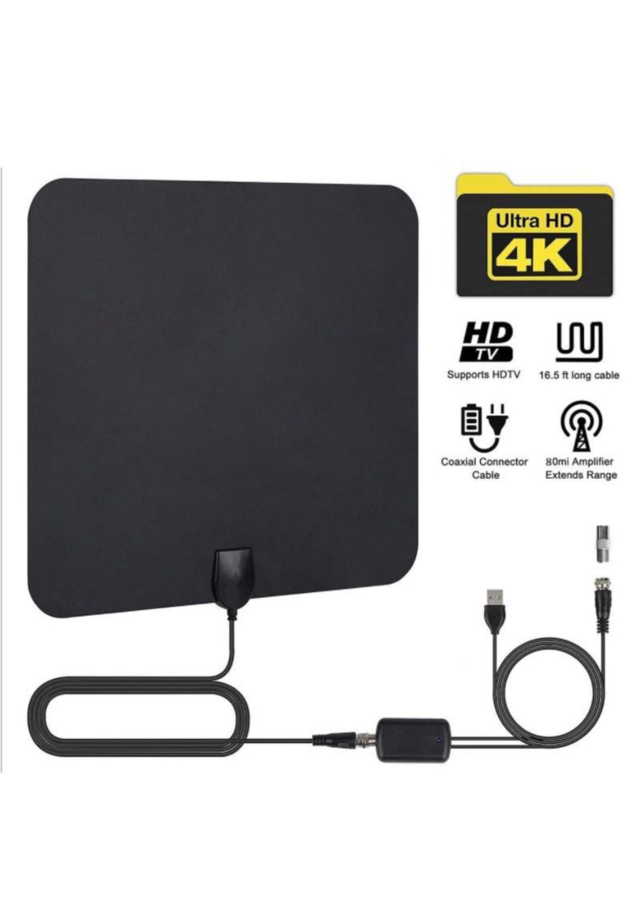 Feature -Support 1080p and 4K,Watch over-the-air network broadcasts of Freeview-The antenna offers a unique and compact design for reliable, multi-directional and high performance UHF and VHF reception from up to 60 miles range-Call out all "Free" channels-New amplifier includes the most advanced Smart IC Chip and the most advanced CleanPeak Filter technology to filter out signals resulting in a clearer picture with low noise-This durable construction removes signal interference, bringing superior reception and powerful signal reliabilitySpecifications *Material: ABS*Coaxial Cable: 4M length*Impedance:75Ohm*Connector Type:F Male*V.S.W.R.:<=1.5,Max:1*Working Frequency: 174~240MHz,470~862MHz*Gain:25 dBPackage Includes: *1 x digital VHF UHF TV antenna*1 x manual*1 x amplifier*1 x spare stickers
