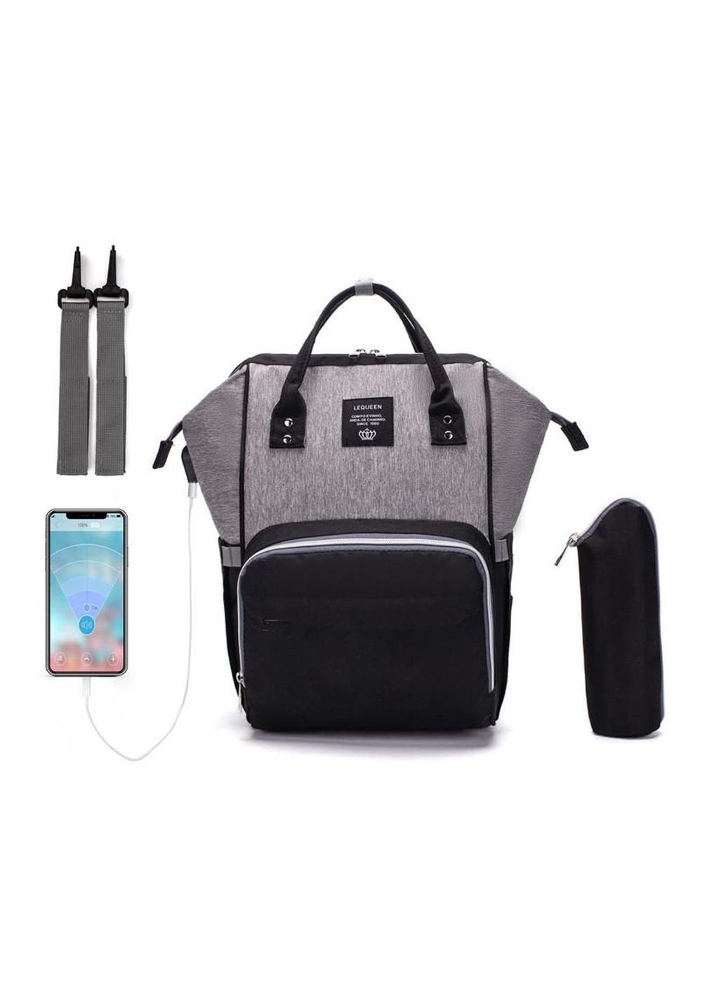 Feature:Carry this “Mom” bag with confidence. This Nappy bag is made for parents so that you can carry all of your baby’s needs without a problem!No worries about carrying so much stuff. This bag is made to be carried in 2 ways; it has cushion straps so you can carry it on your back as a backpack and it has an easy grab top handle so you can carry it in your hands as a handbag.It has a separate thermal bag where you can put your baby’s feeding bottle and be ready whenever they need one.The inside of this bag is filled with various partitions to keep things organized and in place. You can put the clothes, diapers, and other things in the compartments and put the powdered formula in the middle. No worries about the powder spilling.The package includes 2 stroller straps so you can latch the bag onto your kid’s stroller, to free your hands and shoulders from carrying the whole weight of the bag.It also has a USB Charging Port where you can slide your charging cable to discreetly charging your phone.Specification:Material: PVC, Oxford FabricColor: Wine, Purple, Green, Black, Dark GreyCapacity: 20-35LSize: 40*27*18cm Pack list:1 * Mommy Bag2 * Stroller Straps1 * Insulated Bag