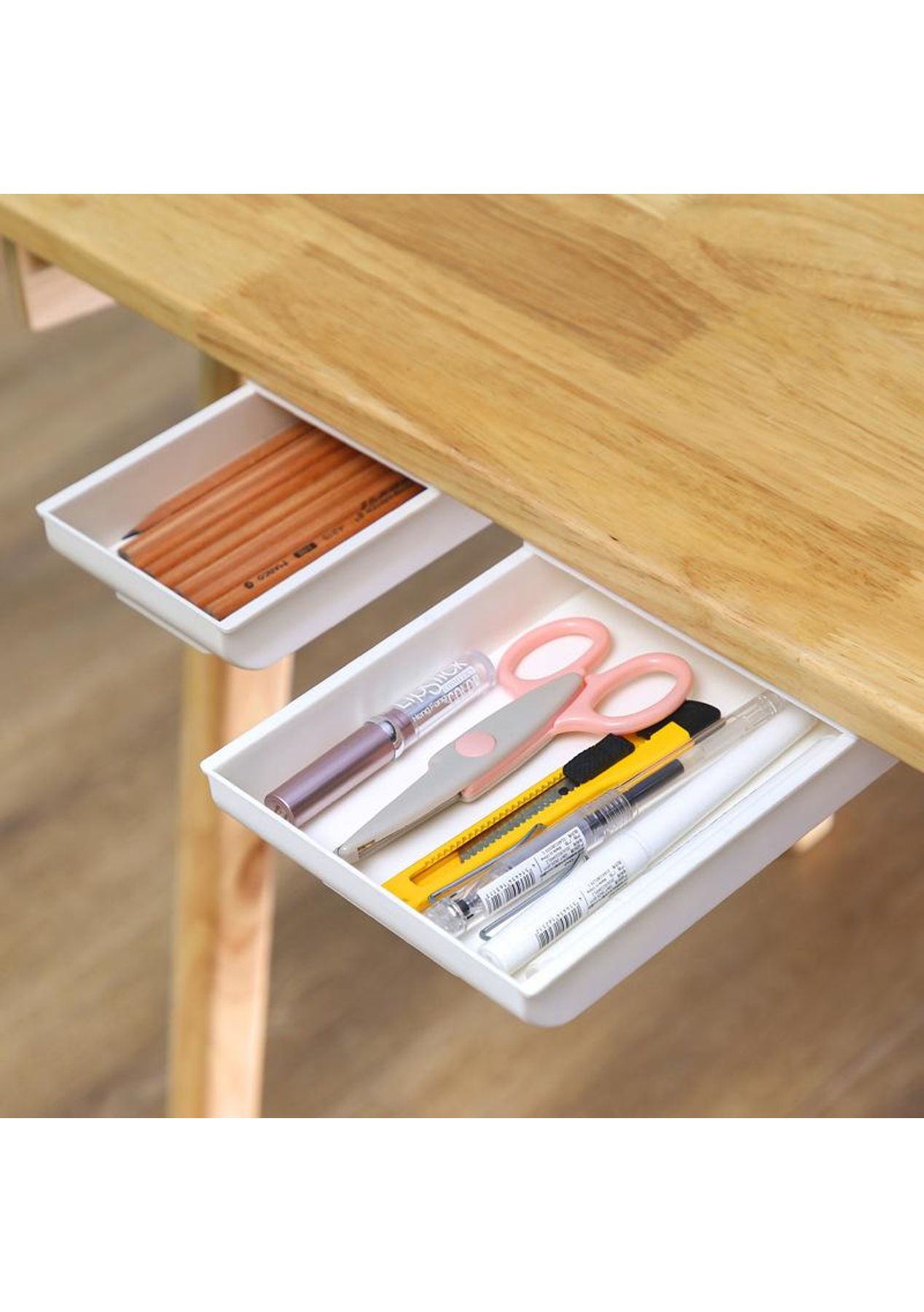 Feature Neat and Clean Desktop: It helps to clear messy desktops and opens a larger workspace HIGH-QUALITY MATERIALS : The under desk mini drawer adopts durable premium ABS material Large Storage Capacity: Get more storage space with the Sliding Under-Desk Pencil Drawer. This under desk drawer is spacious enough to hold office accessories Hidden Storage: Invisible storage placed at the bottom of the desk, it does not take up the desktop space. Easy to Install: Equipped with self-adhesive glue surface, installation is simple Specification Material: ABS Color: white / gray Small Size: 21.8*11*3.2cm Large Size: 21.8*15.5*3.2cm Pack list 1 * Small storage bag 1 * Large storage bag 2 * Double-sided tapes