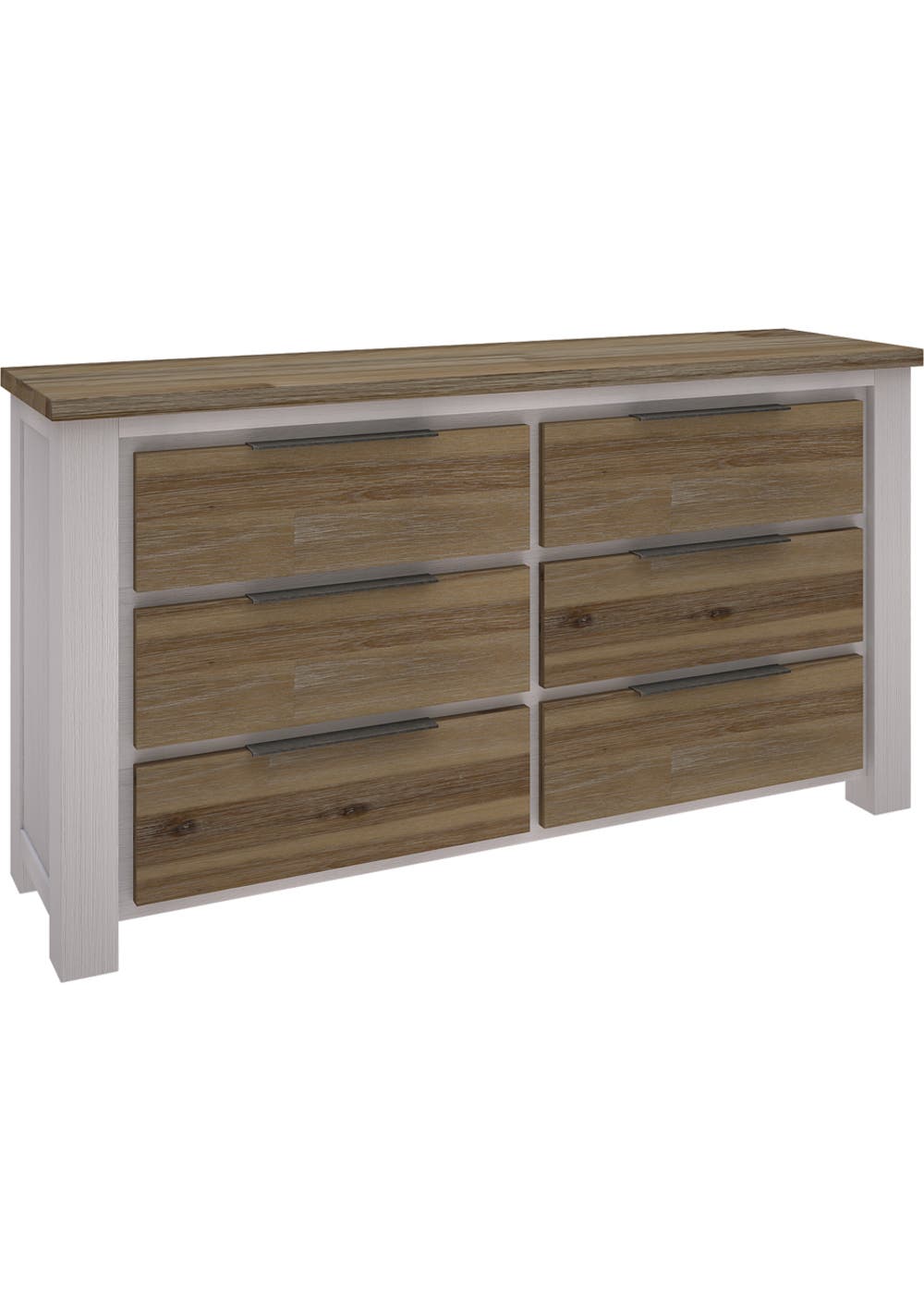 Natural acacia wood contrasts effortlessly with white to create the coastal inspired Fantail Range, that is as eye catching as it is functional. The dresser features six drawers and pairs perfectly with the rest of the Fantail Bedroom Range. Also available as lounge and dining ranges. Additional Information Colour: White and Timber Warranties: 2 Year Product Measurements: L1500xW450xH800