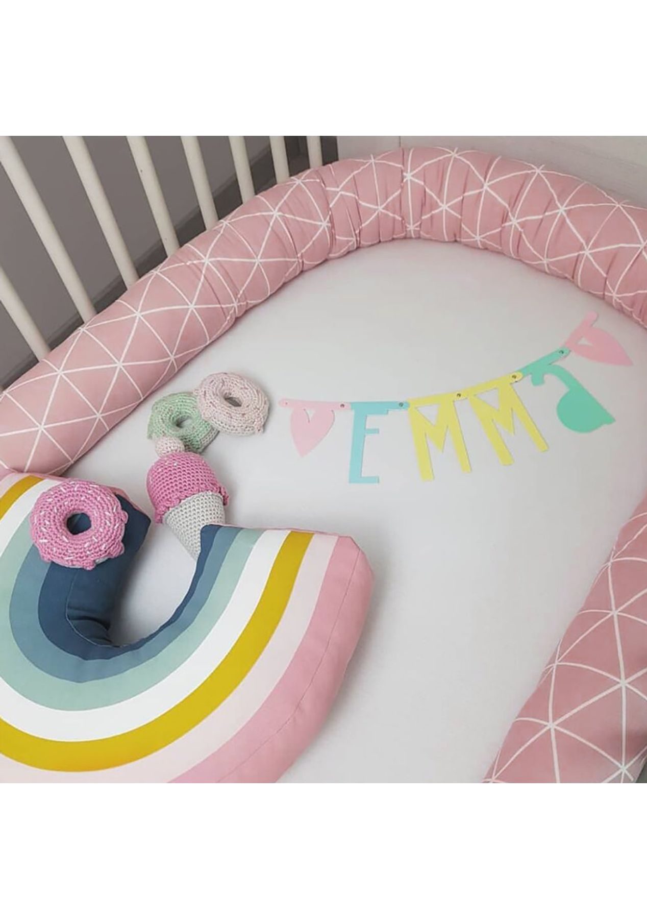 The cuddly soft cot bumper does not only create a feeling of safety in your little one but it is also a super versatile companion. It provides the ideal protection in the cot and on the changing table and is also perfectly suitable for being used as a support cushion and for playing and cuddling. Details: Length: approx. 200 cm Diameter: 11cm Weight: 500g Machine washable up to 60°C Padding made of polyester batting Cover made of cotton Particularly soft and skin-friendly Suitable for being tumble dried, thermally reduced Suitable for kids 18 months+. Adult supervision required.