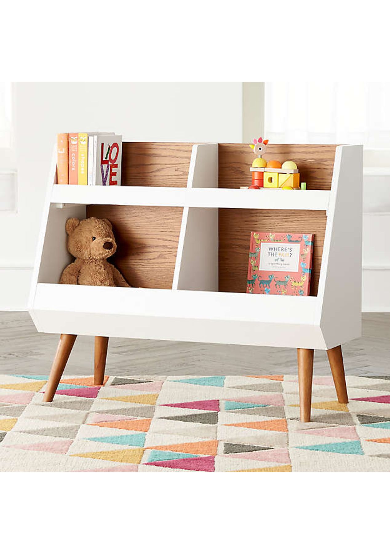 We skipped ahead in our book about building the perfect bookcase to bring you our Next Chapter Bookcase. Exclusively designed for us by Mark Daniels, it features a walnut and white contrasting finish and a contemporary modern design. Its four roomy compartments are great not just for books, but for toys, too. Walnut and White Mid-Century Bookcase 36"Wx14"Dx30"H A Mark Daniel design Bottom compartments measure 17"w x 12"d x 13"h; Bin is 4"d Top compartments measure 17"w x 7.75"d x 6.25"h; Bin is 1.25"d Adjustable levelers for uneven floors Assembly required Low emission engineered wood and solid rubberwood legs (Grey/White) Oak veneers over low emission engineered wood and solid rubberwood legs (White/Walnut) Select soft plastic toys can react with and cause damage to the finish of the bookcase when left in prolonged contact. Take care to occasionally check toys and the bin to prevent damage WARNING: Kids shouldn't play on this piece. Install tip restraint kit to prevent serious or fatal injury
