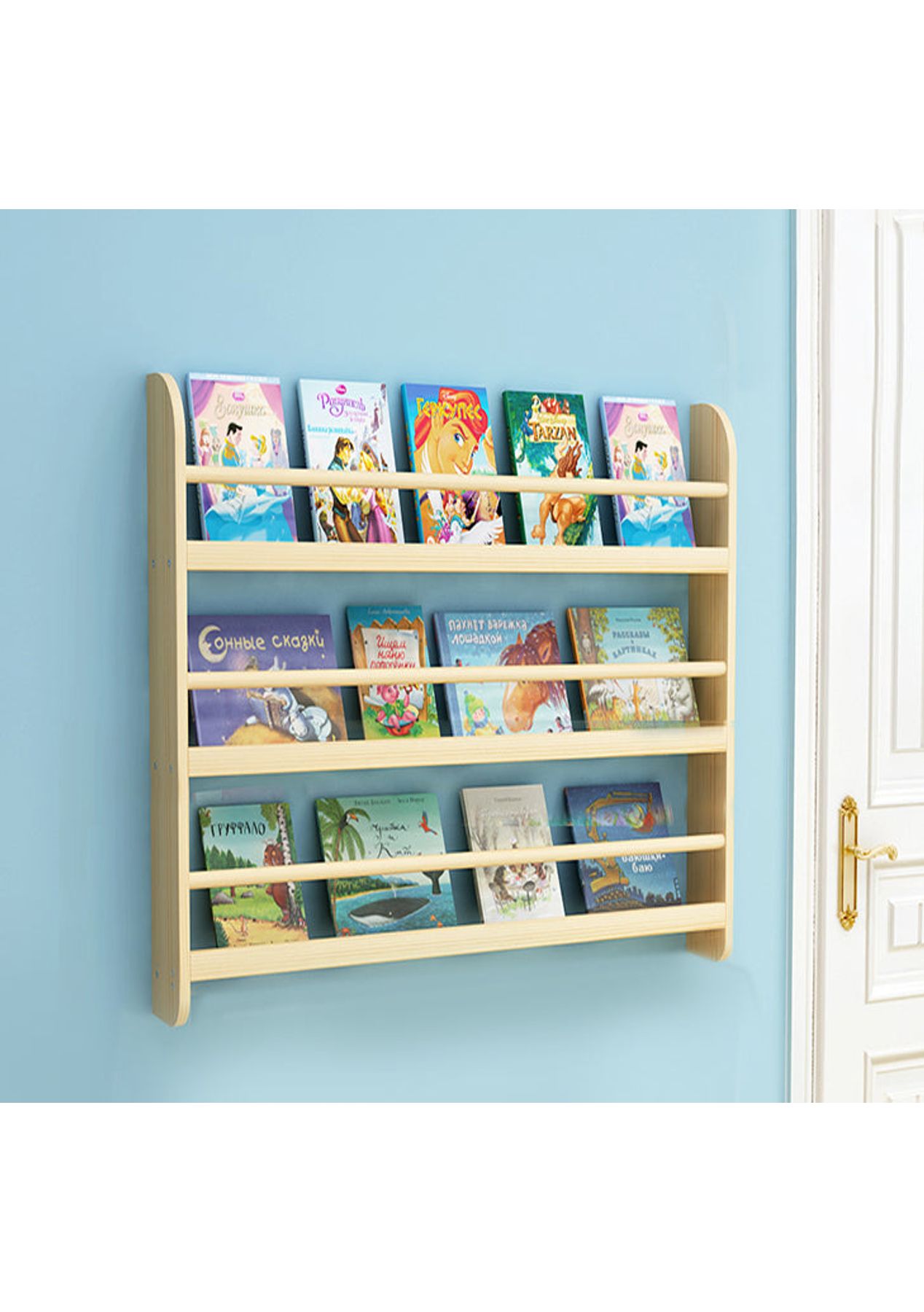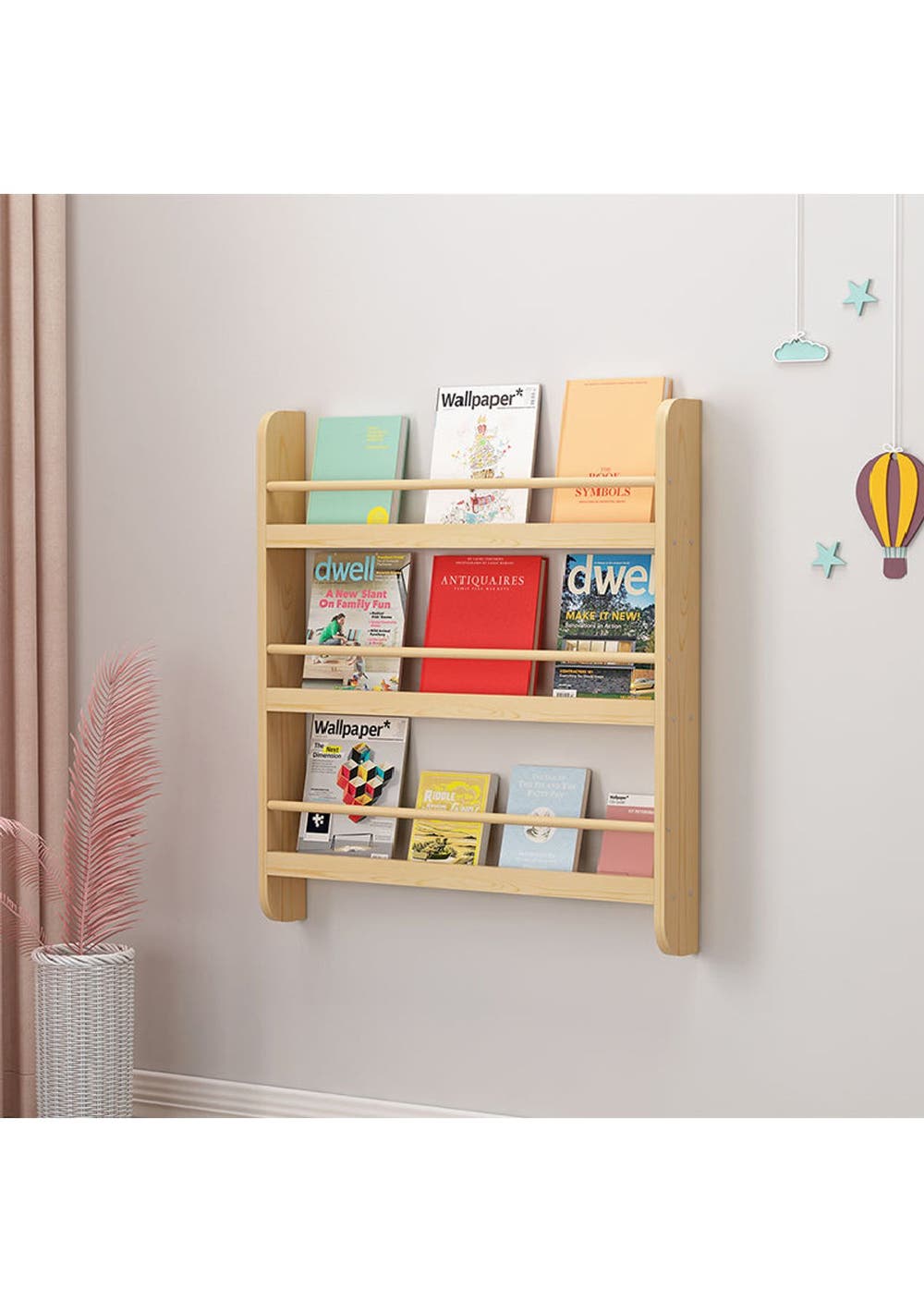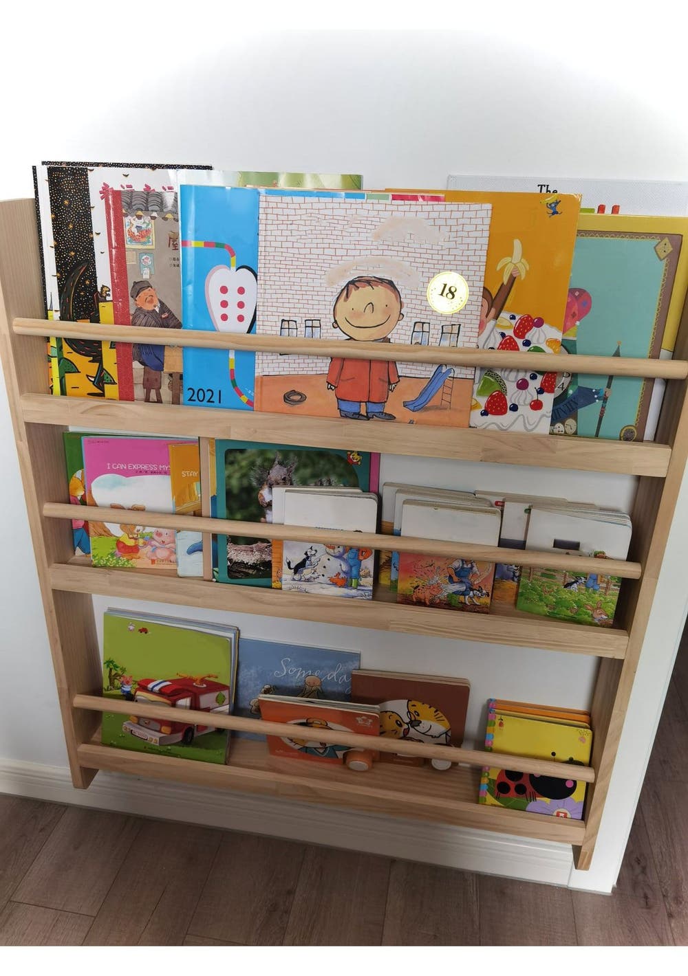 Simple and sturdy. This bookshelf is ideal for your kids to well organize their books and toys. The curved edge protect children from collision. The sturdy wooden frame gives this shelf support of enthusiastic readers in the coming years. Features Wall-Mountable Design - The wall mountable bookshelf helps to develop your kids with good habits, making it encouraging to read books and return it back by himself. The wooden pole can avoid the book falling and help kids to identify easily and grab books. Definitely a clean and warm reading environment! Space-Saving - kids bookcase designed with 3 tiers which can easily store around 30 kid's books at least. Also, it can easily to organize books, newspapers, magazines or even small toys with easy to clean your rooms with more space saving. Selected Material - Crafted from high-quality natural wood, durable and easy to clean. First-Class Stability - The surface is smooth and flat, making it easy to clean with damp cloth. Easy Assembly - Sized 80L x 12W x 90H cm, 3-tier shelf bookcase comes with detailed and illustrated instructions and required accessories.