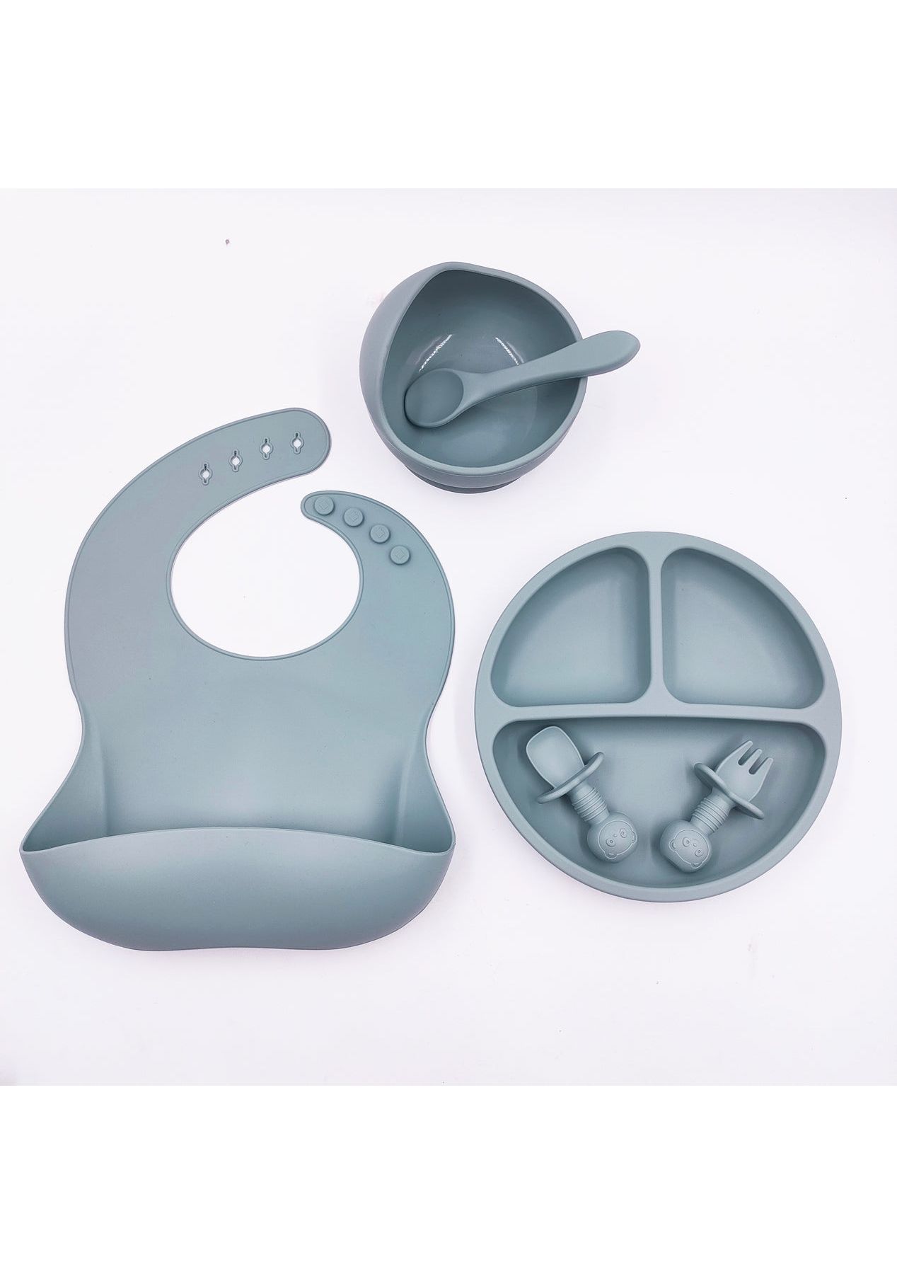 It's meal time! Silicone Baby Feeding Set (6 pieces) 4 colours available. 100% Silicone, BPA Free, Phthalates Free, Lead Free, PVC FreeDishwasher SafeMicrowave SafeHeat Resistance to 220CPlate 20x20cm Diameter with 5cm Height*bib 30*23cm bowl 11.5*8.5cm