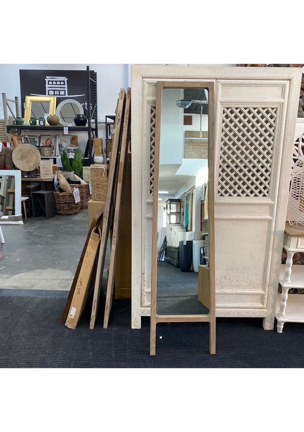 - Free standing Oak wood mirror - Soft rustic finish - Sleek and Modular - We recommend bracing it to the wall Material Elm Wood Frame Dimensions 50 x 4 x 200 cms