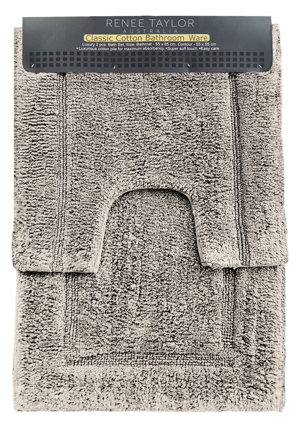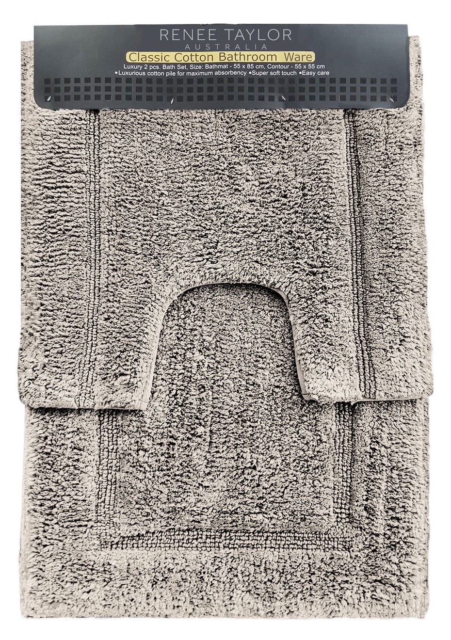 Renee Taylor 2 Piece Bath Mat Sets 2200 GSM Keep your home styling consistent with the 2200 GSM 2 piece Cotton Bath Mat and Contour pedestal set. Featuring a matching bathmat and toilet slip with solid colour tone design, this set will add warmth and take the chill off any bathroom floor. It is made from durable cotton fabric. Features: -Created using luxuriously soft combed cotton -2200 GSM, heavy weight bath mat -Timeless elegance -Classic border -Fully machine washable Sizes: -Bath Mat: 55 x 85 cms Contour Mat: 55 x 55 cms