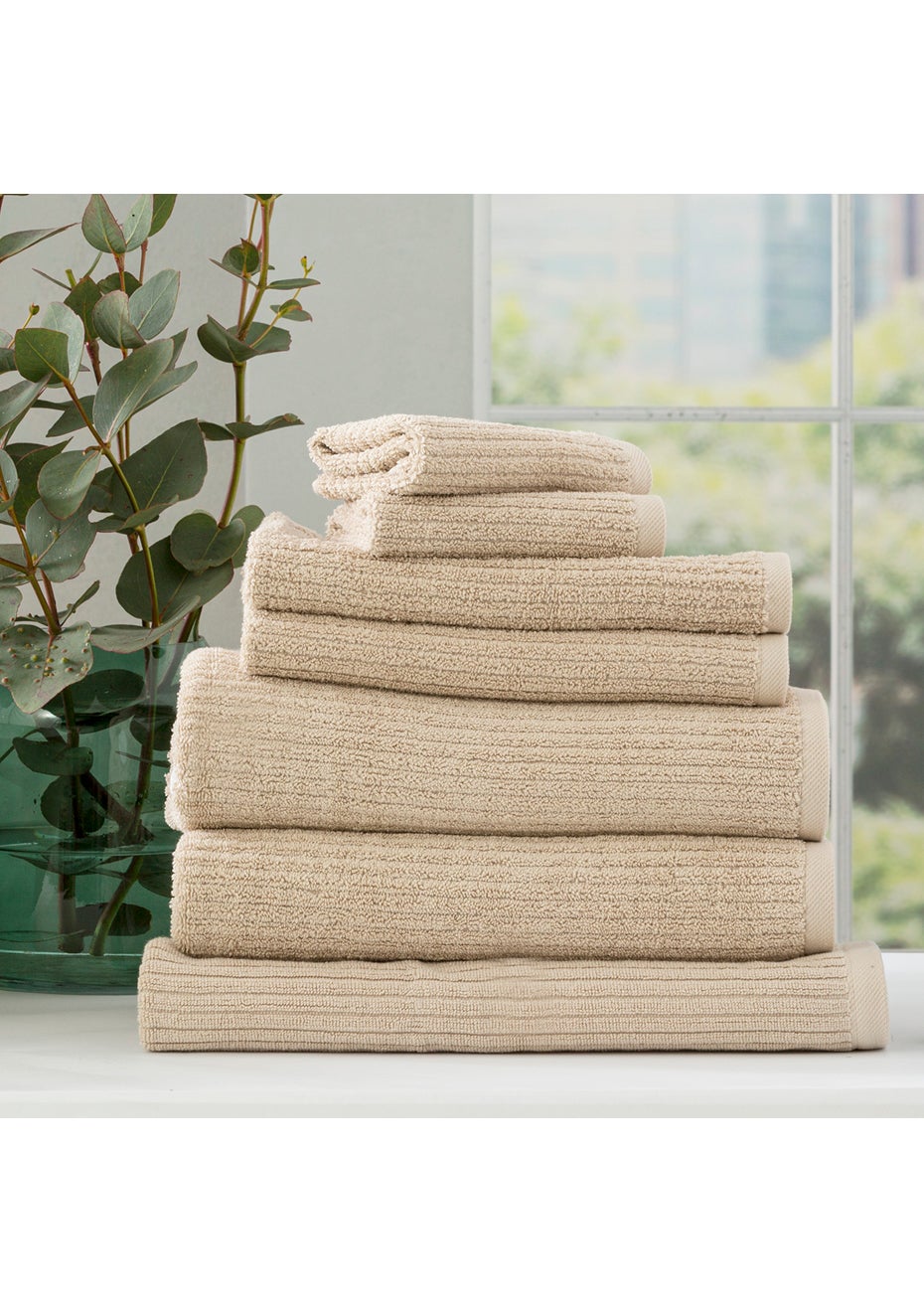 Renee Taylor Cobblestone 650 GSM Cotton Ribbed Towels The classic rib texture and borderless design of cobblestone towels will add a clean, simple style to your bathroom. Made from exquisite cotton low twist yarn, this towel offers extreme softness, colour lustre, absorption, and durability. This ribbed towel is available in a palette of contemporary colours from neutrals to statement tones. Key Features -Made from exquisite cotton low twist yarn, this towel offers extreme softness -Vertical ribbed towels in a generous 650gsm weight -This ribbed towel is available in a palette of contemporary colours from neutrals to statement tones. -Incredibly plush, soft towel with instant absorbency -Will remain soft after washing and tumble drying. Pack Contains: - 2 x Bath Towel - 70 x 140 cms - 2 x Hand towel - 40 x 60 cms - 2 x Face towel - 33 x 33 cms - 1 x Bath mat - 50 x 80 cms (900 GSM) Wash Care: Wash prior to first use. Launder whites, colours, and prints separately. Warm machine wash (40c). Do not rub, soak, or wring. Do not bleach. Line dry in shade or tumble dry warm. Do not iron. Do not dry clean (x). To maintain optimum performance of this towel, we recommend that you avoid using fabric softeners, as they decrease the towel's absorbency. If you have a pulled thread, do not pull it. Simply snip off the loop with sharp scissors. Trimming a pulled thread will avoid further pulling and will not affect the durability or performance of your towel. It is quite normal for a cotton towel to lint or fluff in the few initial washes. This will diminish with subsequent washes and tumble drying. Remember to clean out the filters of your washing machine and tumble dryer. Made in Pakistan.