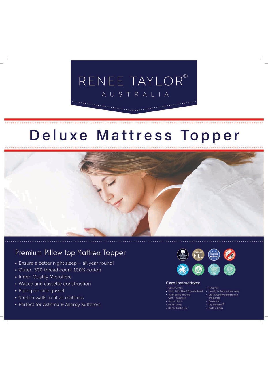 Renee Taylor Deluxe 1000 GSM High Loft Fully Fitted Mattress Topper Sink into cushiony comfort and enjoy a relaxing night's sleep with Renee Taylor Deluxe 1000 GSM Mattress toppers. Encased in a breathable 300 thread count cotton cover, this mattress topper is filled with a cushion of 1000 GSM Microfiber for a comfortable sleep. It has been trimmed with an elegant satin piping and a gusset edge. The deep stretch walls offer a snug fit. The box stitch quilting pattern ensures an even distribution of fill, this ensures a high loft, and that maximum shape retention is achieved. Each topper is treated with a Health guard finish for ultimate protection from allergies and dust mites. Fully machine washable and all year-round products. Features: -Outer: 300 thread count cotton cover. -Filling: Fine spun Polyester. -Gusseted and piped for maximum comfort. -Squared quilting for maximum loft. -Machine washable. -Dust and mite resistant. Non – allergenic, non – irritant. Sizes: -Single - 1 x Topper 91 x 193 + 40 cms - King Single - 1 x Topper 107 x 203 + 40 cms -Double - 1 x Topper 137 x 193 + 40 cms -Queen - 1 x Topper 152 x 203 + 40 cms -King - 1 x Topper 180 x 203 + 40 cms -Super King - 1 x Topper 203 x 203 + 40 cms Wash Care: Top: Cotton Filling: Polyester Warm Gentle Machine wash- separately Do not bleach, do not wring Do not tumble dry Rinse well, Line dry in shade without delay Dry thoroughly before reuse and storage Do not iron. Do not dry clean. Made in China.