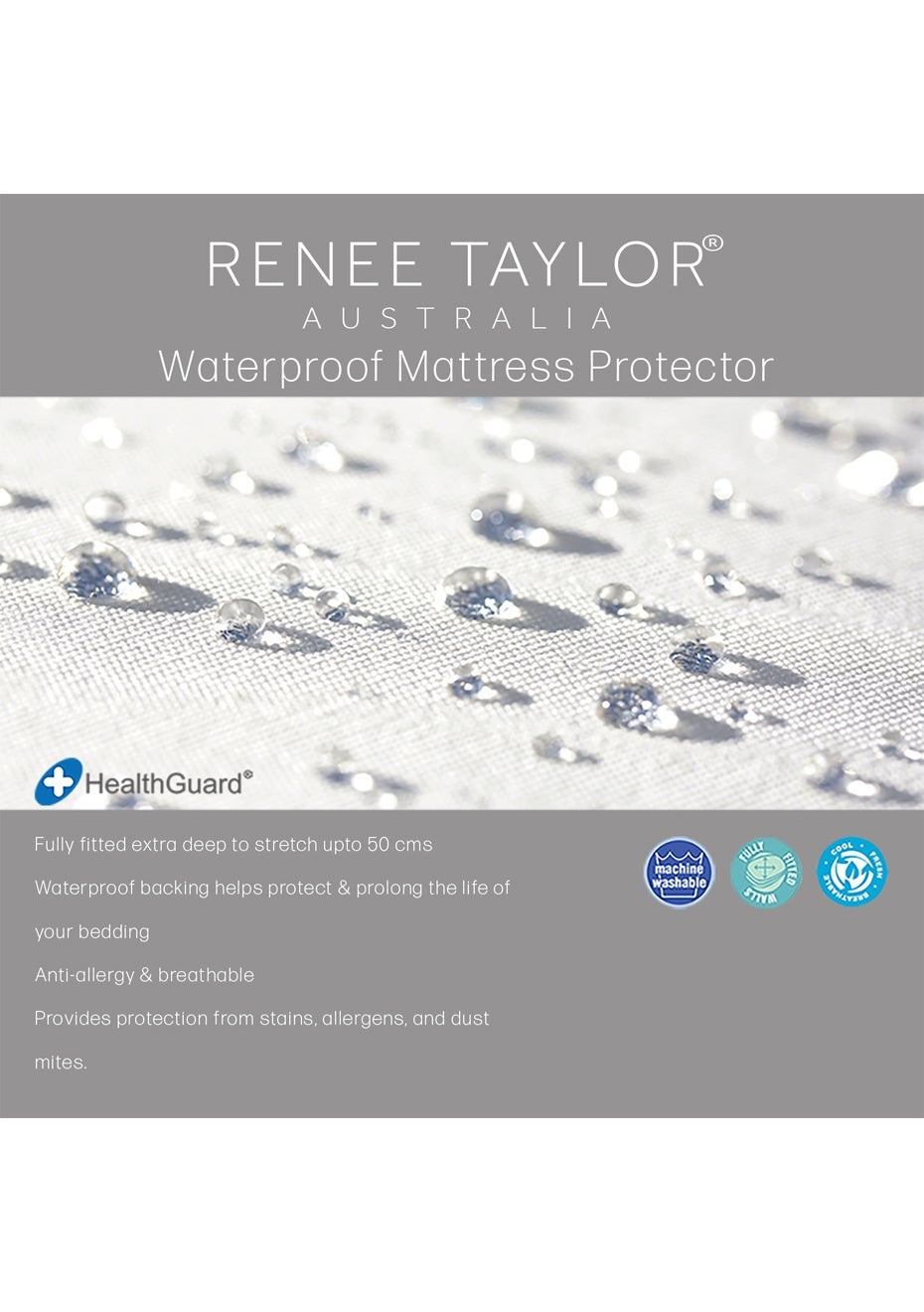 Renee Taylor Premium Waterproof Mattress Protector Use a waterproof mattress protector to keep your mattress protected for years to come. Renee Taylor waterproof mattress protectors are made of smooth, breathable terry cotton and have a polyurethane waterproof backing. They are naturally anti-bacterial, dust mite and mould resistant, making them ideal for allergy sufferers. Available in all size. Easy machine wash makes our waterproof protector more popular. No problem if your mattress is high because all our mattress protectors are appropriate for high mattresses due stretchable skirt. Features: -Terry towel cotton pile and waterproof back. -Outstanding stain and allergen defence. -Fully fitted and easily fits high mattress. -Hypo-allergenic and Immune to dust mites. -Easy machine washable. Sizes: -Single - 1 x Protector 91 x 193 + 40 cms - King Single - 1 x Protector 107 x 203 + 40 cms -Double - 1 x Protector 137 x 193 + 40 cms -Queen - 1 x Protector 152 x 203 + 40 cms -King - 1 x Protector 180 x 203 + 40 cms -Super King - 1 x Protector 203 x 203 + 40 cms Wash Care: Pile: Cotton Backing: Polyurethane Warm Gentle Machine wash- separately Do not bleach or tumble dry Rinse well, Line dry in shade without delay Dry thoroughly before reuse and storage Do not iron. Do not dry Clean. Made in China.