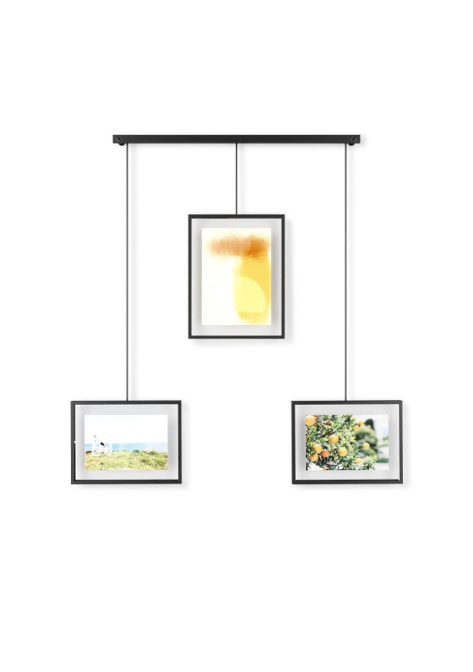 Exhibit Photo Display features a wall-mounted brushed metal ledge with clips and brackets to hold three gallery-style picture frames of various size, all while reducing the amount of damage typically left on walls. The brackets with the frames are suspended from the ledge, which allows them to be moved around to create various layouts. Its flexible horizontal hanging properties make Exhibit a great addition to your stairway due to its ability to be hung angled. Use Exhibit to set a décor accent in your living room, bedroom, entryway, office or studio and give it a modern update while curating your favorite photos and artwork. Exhibit is customizable to your layout preference. The picture frames can be moved around the metal ledge and rotated to a landscape or portrait orientation. Exhibit features two 4x6 and one 5x7 picture frames to fit all of your favorite photos, artwork, illustrations and more. Complementary to multiple decor styles, Exhibit makes is a beautiful wall decor piece that allows you to change out images easily to refresh your room any time you want. EU Design 008159107-0001. MULTI-PHOTO WALL DISPLAY: Display your favorite photos in an eye-catching fashion using these three hanging, gallery-style frames suspended from a modern and sleek beam; features two 4x6 and one 5x7 picture frame CUSTOMIZABLE LAYOUT: Each picture frame can be moved around the included metal beam, while the hanging rods can be interchanged to create multiple configurations to best fit your space UNIQUE WALL DECOR: Exhibit makes for an eye-catching and modern wall art display. Add a second Exhibit to create an engaging wall decor statement CREATES LESS DAMAGE: Avoid the damage created by hanging multiple picture frames on your wall, Exhibit only requires two screw holes to hang 3 frames (includes mounting hardware)