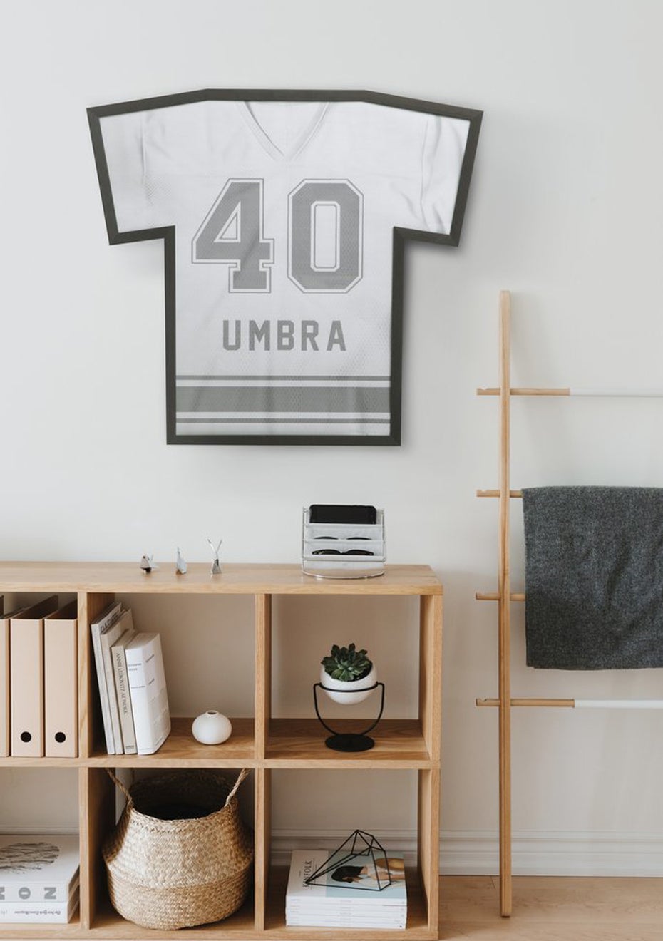 This unique T-Shirt display case is made to showcase your favorite sports, concert, graphic or athletic t-shirts. Since it’s shaped like a t-shirt, you can easily fold your shirt into the frame for a compact display that will keep it looking pristine. Included is a folding guide allowing you to align your shirt perfectly in the frame. With this quick and easy to use solution, you don’t have to worry about your shirt sagging in a shadowbox, or being unprotected outside a frame. Made with shatter-proof acrylic your t-shirt will be safe and dust-proof behind this wall display. Simply fold your t-shirt on the built-in folding template and then place the jersey inside the frame. Umbra’s T-Frame is available in a small (21.88 x 19.88 x 1.13 inches), medium (28.54 x 24.37 x 1.18 inches), and large (36 x 32.88 x 1.25 inches) size to accommodate your different t-shirts and jerseys. We strongly recommend you measure the portion of your t-shirt which you intend to display PRIOR to ordering to ensure it will fit correctly. US Patent No. D682,581 UNIQUE T-SHIRT SHAPED FRAME: Display your favorite t-shirt on any wall with this modern frame designed to create a memorable piece of wall art while still preserving the iconic t-shirt shape TURN YOUR T-SHIRT INTO ARTWORK: Umbra T-Frame is the ultimate way to show off all sorts of t-shirts including graphic tees, statement tees, brand & logo t-shirts, sports & athletic t-shirts, memorabilia & concert t-shirts, artsy t-shirts, and more WINNER OF THE PRESTIGIOUS PRATT INSTITUTE DESIGN COMPETITION: This creative, one-of-a-kind design from Caleb Ferris and Prakhar Mehrotra was the winner of Umbra's annual design competition done in conjunction with the Pratt Institute School of Design in 2012 EASY TO SETUP: Umbra T-Frame includes a folding template to ensure your t-shirt stays in place and looks its very best. Umbra’s T-Frame is also available in a small and large size to accommodate your different sports jerseys, t-shirts and memorabilia.