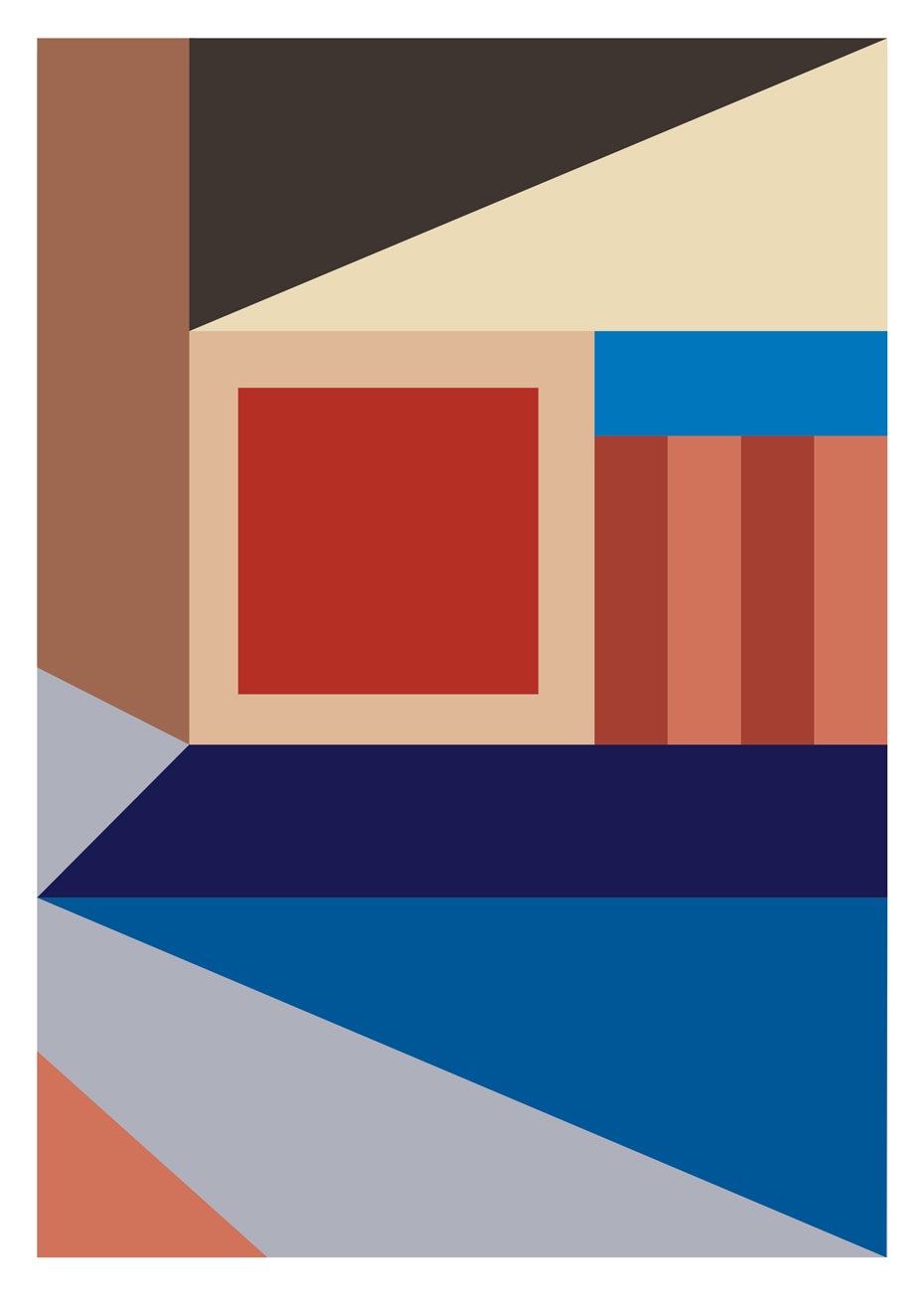 Hyperstation', 2023, thrusts you into a thrilling realm of architectural futurism, a geometric masterpiece that boldly embraces the raw essence of brutalist forms. This hard-edged composition pulsates with a frenetic energy, captivating the viewer and spiralling them into the heart of its structural core. Each line and angle is a deliberate dance of dynamism, an invitation to explore the interplay between order and chaos. Step into a visually charged experience where the future converges with artistic intensity, as "Hyperstation" immerses you in a world where the boundaries of form and function collide with electrifying vitality.