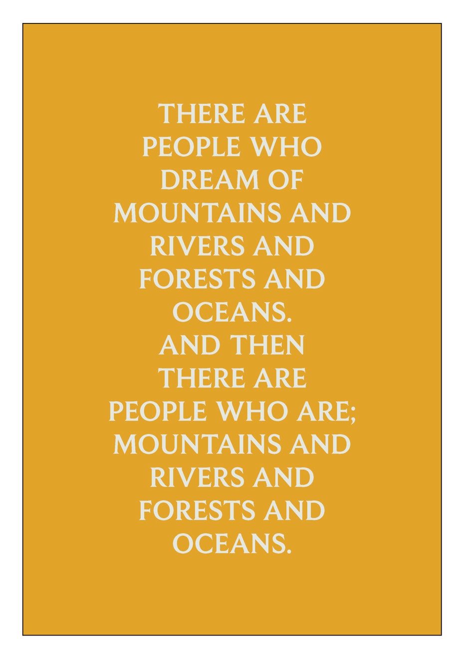These prints hold poetry and memory close to their hearts. The colours are bright and joyful and the messages contained within both works speak to the human condition. 'There Are People', 2023, is about witnessing the essence or ahua of the people in our lives and I’ve used these metaphors to describe people. I am a person who dreams and there are some people who are and have been deep oceans and strong rivers in my life. There is also a great repetition within this work; I really wanted you to think about mountains and rivers and forests and oceans.