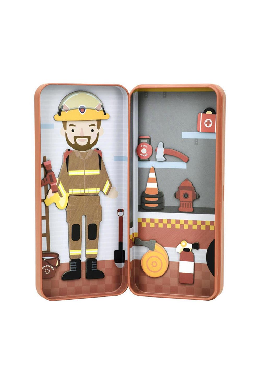 Little Box, Big Dream! This puzzle box encourages children to dream big. Play with more than 30 magnets to build their characters in various outfits and learn about the role of being a Firefighter. All pieces are stored in a handy tin for easy travel.