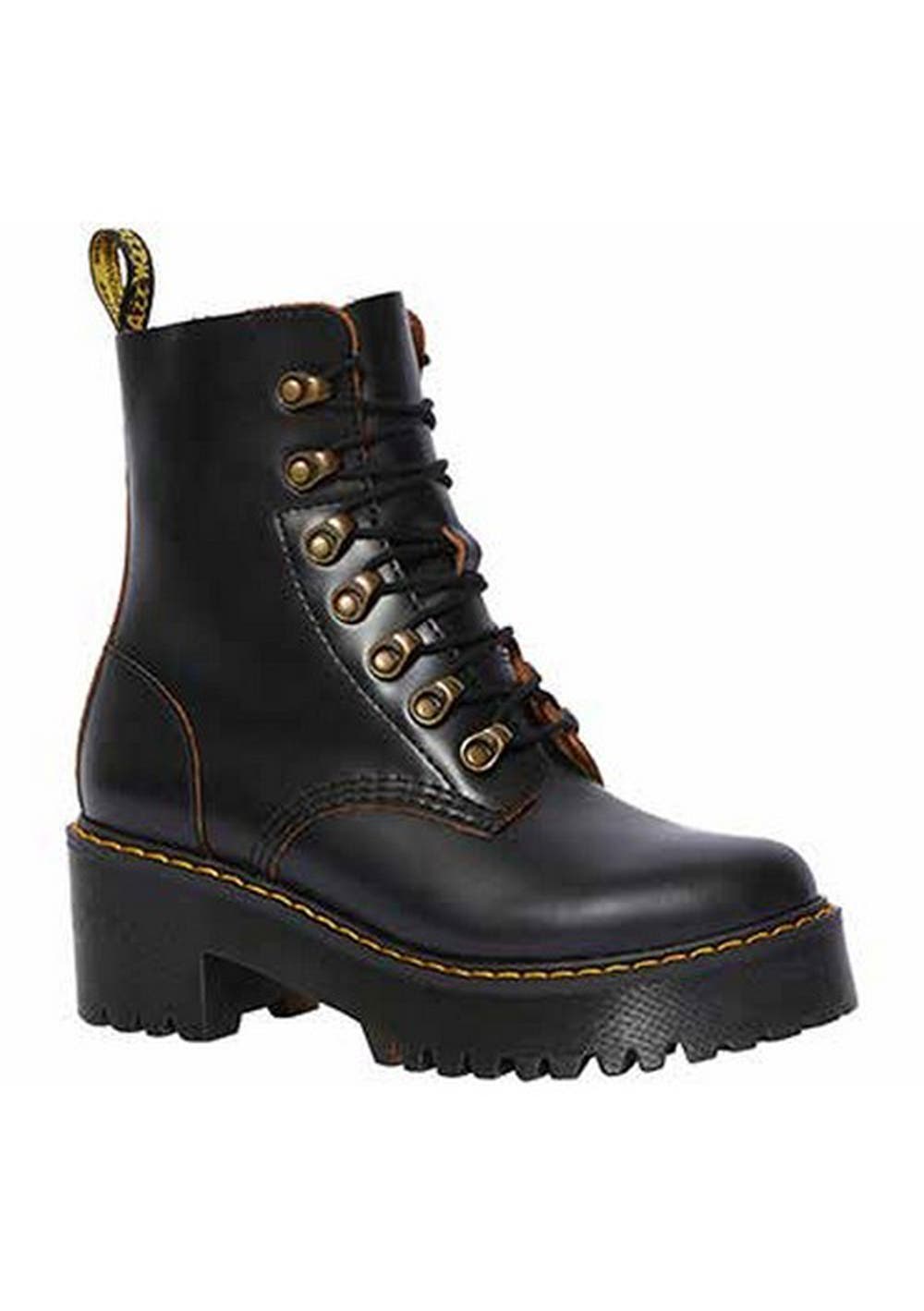 The Leona is packed with rugged features: a commando tread, an extra-empowering platform sole with a chunky heel, antiqued brass tunnel eyelets and a sleek silhouette. The result? A women's boot that strikes the perfect balance between femininity and the tough, rebellious Dr. Martens spirit. Made with Vintage Smooth, a retro version of our signature smooth leather with subtle grained effect and contrast base color Built on the rebelliously comfortable Dr. Martens Airwair™ air-cushioned sole Sole is slip-resistant with superior abrasion, and is oil and fat resistant, too Classic Doc's DNA is in full effect, with visible stitching, grooved sides and a scripted heel-loop Platform height is 1.5', and heel height is 2' MATERIAL A retro version of our signature smooth leather with subtle grained effect and contrast base color. CARE INSTRUCTIONS Clean away dirt using a damp cloth and allow to dry, then apply Dr.Martens Neutral or coloured wax polish as appropriate, using a Dr.Martens shoe brush, (Neutral can be applied to all colours). Allow to dry, then buff vigorously to desired shine using a second clean Dr.Martens shoe brush. (We advise to use 2 brushes per colour, one to add the polish and the second, clean dry brush, to buff up the leather for the best results). CONSTRUCTION The sole is cemented to the upper.