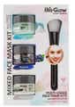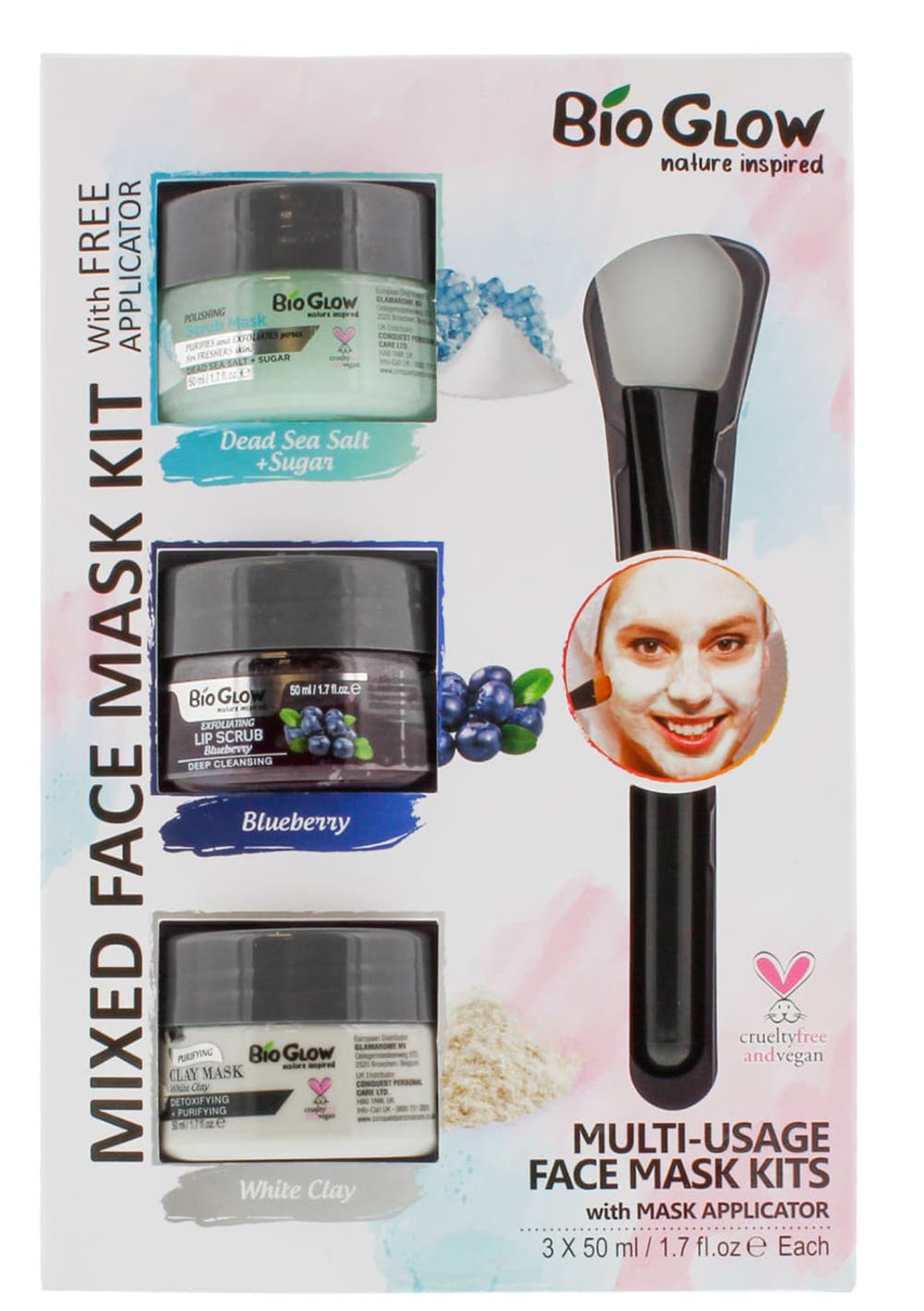 Contains: 1x Dead Sea Salt + Sugar Polishing Scrub Mask (50ml), 1x Blueberry Exfoliating Lip Scrub (50ml), 1x White Clay Purifying Clay Mask (50ml), 1x Mask Applicator. Bio Glow 3pc Mixed Face Mask Kit with Free Applicator