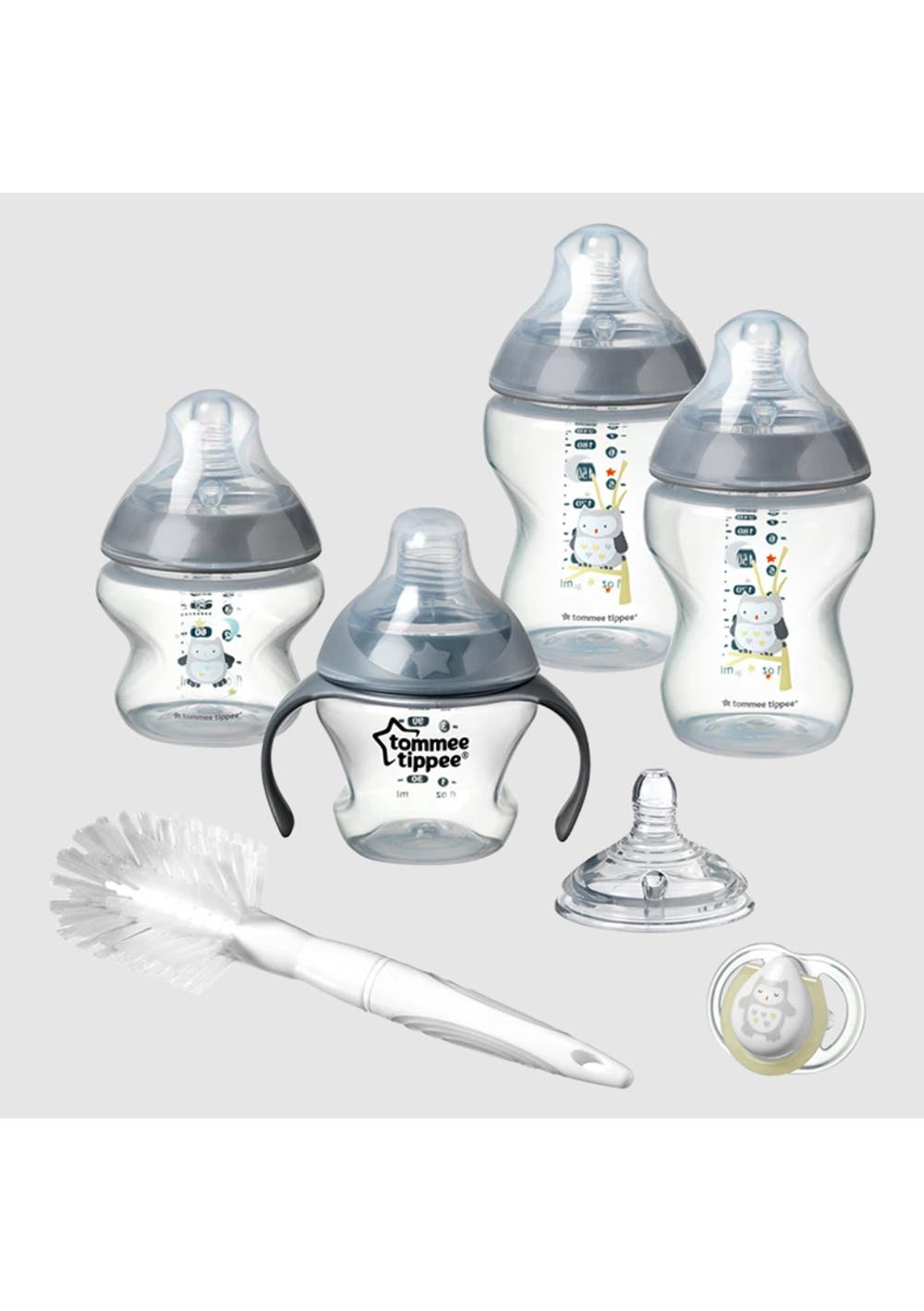 Starter Set includes 2 x 150ml Baby Bottles with Slow Flow Teats, 2 x 260ml Baby Bottles with Slow Flow Teats, 2 x Medium Flow teats, 1 x Transition Cup 4m+