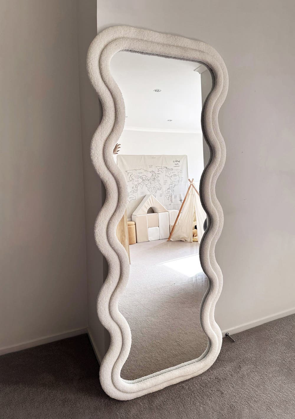 Designed Exclusively for Onceit, our George Collective brand is a contemporary and premium range for the home. Introducing our Standing Wavy Mirror, the irregular design on this full-length mirror is trendy and the wavy shape adds personality to your space. Upholstered in luxe boucle fabric, add character to your room by choosing from the many colours available. Simply lean the mirror at a slight angle against the wall and you room will be instantly transformed! Product Details Dimensions: 170cm x 70cm Weight: 12.8kg Material: Mirrored glass, Medium density fibreboard (MDF), polyester fabric. Suitable for indoor use only. Warning: Fragile, handle with care.