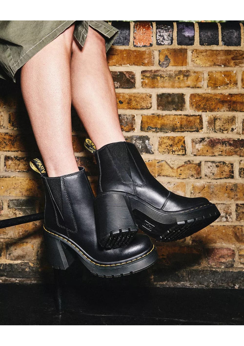 There are Chelsea boots. And then there's the Spence. Our new season boot is stacked high with a grooved outsole and towering flared heel — built to make you feel on top of the world. Made from a soft yet rugged new leather, Sendal, and marked with all our signature DNA, these hard-hitting boots are even tougher than they look. Sendal is a semi-aniline, natural-looking nappa leather with a smooth full-grain finish. Clean with a damp cloth and care with Dr. Martens Shoe Polish Our Goodyear-welted lines are heat-sealed at 700°C and reinforced with our signature welt stitch Platform height: 1 1/8 in; Heel height: 3 3/4 in MATERIAL This semi-Aniline, natural-look Nappa Leather features a smooth full-grain finish. CARE INSTRUCTIONS Wipe away dirt using a damp cloth. Apply a neutral or correct colored wax based shoe polish. Buff with a Dr. Martens Shoe Brush to restore shine as desired. CONSTRUCTION Cemented - the sole is cemented to the upper, a durable and flexible construction for all day comfort.