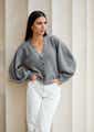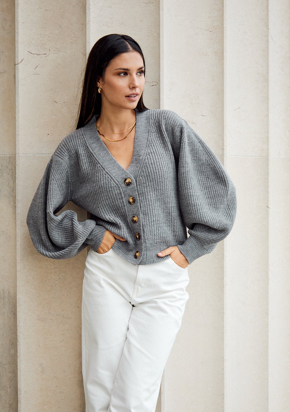 Ida The Label - Puff Sleeve V Neck Cardigan - Grey Marle