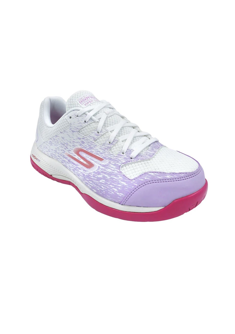 Workout in confidence and supportive comfort with Skechers Viper Court - Netball shoe. This lace-up features a synthetic and mesh upper with a removable Arch Fit® insole, lightweight ULTRA FLIGHT cushioning and a Goodyear® Performance Outsole. PRODUCT FEATURES Synthetic and athletic mesh upper with lace-up front Flexible rubber traction outsole 1 1/4-inch heel Skechers® logo detail Patented Skechers Arch Fit® insole system with podiatrist-certified arch support Podiatrist-designed shape developed with 20 years of data and 120,000 unweighted foot scans Removable insole helps mold to your foot to reduce shock and increase weight dispersion Ultra-lightweight, responsive ULTRA FLIGHT® cushioning Goodyear® Performance Outsole delivers enhanced traction, stability and durability Relaxed Fit® for a roomy comfort fit at toe and forefoot
