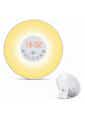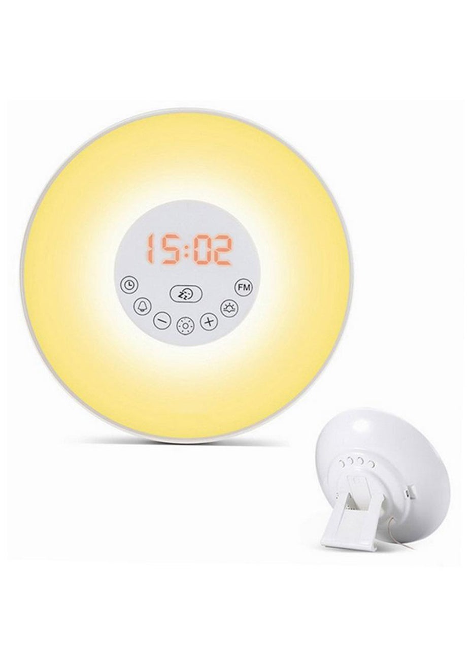 Features: ☆7 Colorful Lights+10 Levels of White Light Brightness:You can adjust the brightness to personal perference;Multi color mode can automatically change the color or manuel adjustment; Wake-Up Light will gradually brighten from 10% of brightness to 100% 30 minutes before your alarm time, the alarm will ring gradually louder which gently bring you out of deep sleep; ☆Unique New Sunset Function:Before 30 minutes the setting sunset time,the white light will from 100% to turn off,the Sunset function guides you to natural, restful sleep; ☆Multifunction:Sunrise & sunset simulation Wake-Up Light + Alarm clock + FM radio;It have 2 types for power supply: DC, link the power outlet; AC, 2 7 batteries or USB connected to the computer, mobile power; ☆This is a humanized Wake-Up Light. With the unique combination of light and sound, you can wake up in a more natural way and feeling more refreshed. You can freely enjoy the radio show you like and relax yourself. ☆6 Alarm Clock Sounds+FM Radio+Snooze:You can choose 6 different sounds to be alarm clock ring for nature wake up youself;Or you can choose your favorite FM;Snooze function is available and repeats in every 5 minutes;