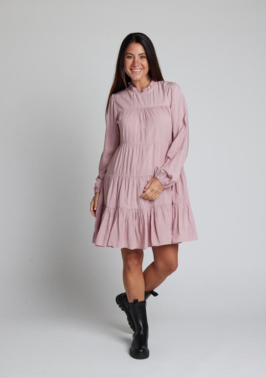 High crew neck knee length dress with frill detail and tiered body layers. 100% VISCOSE