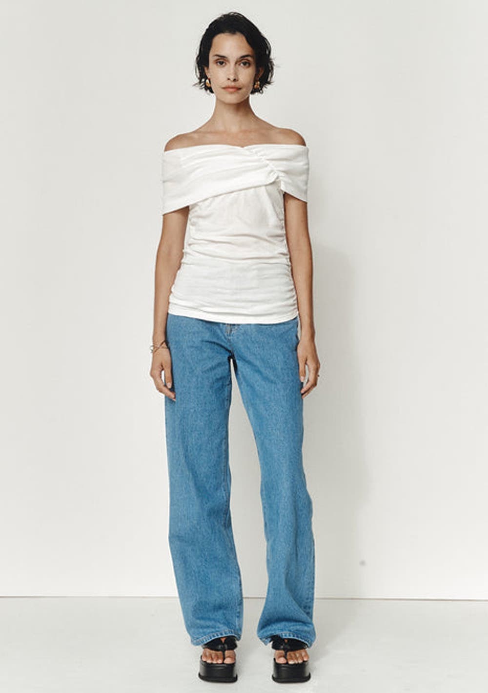 The Blanca Top is a beautifully feminine silhouette crafted in 100% organic cotton. This top has a semi-fitted silhouette through the body, with a subtle gathered detail down the side seams. The top softly wraps around the shoulder, with a diagonal gathered seam creating an asymmetric detail. Care: Cold hand wash with a gentle detergent. Lay flat in shade to dry. Do not wring. Do not tumble dry. Fit: Regular - Shop to size* Fabric: 100% Organic Cotton Features: - Off shoulder