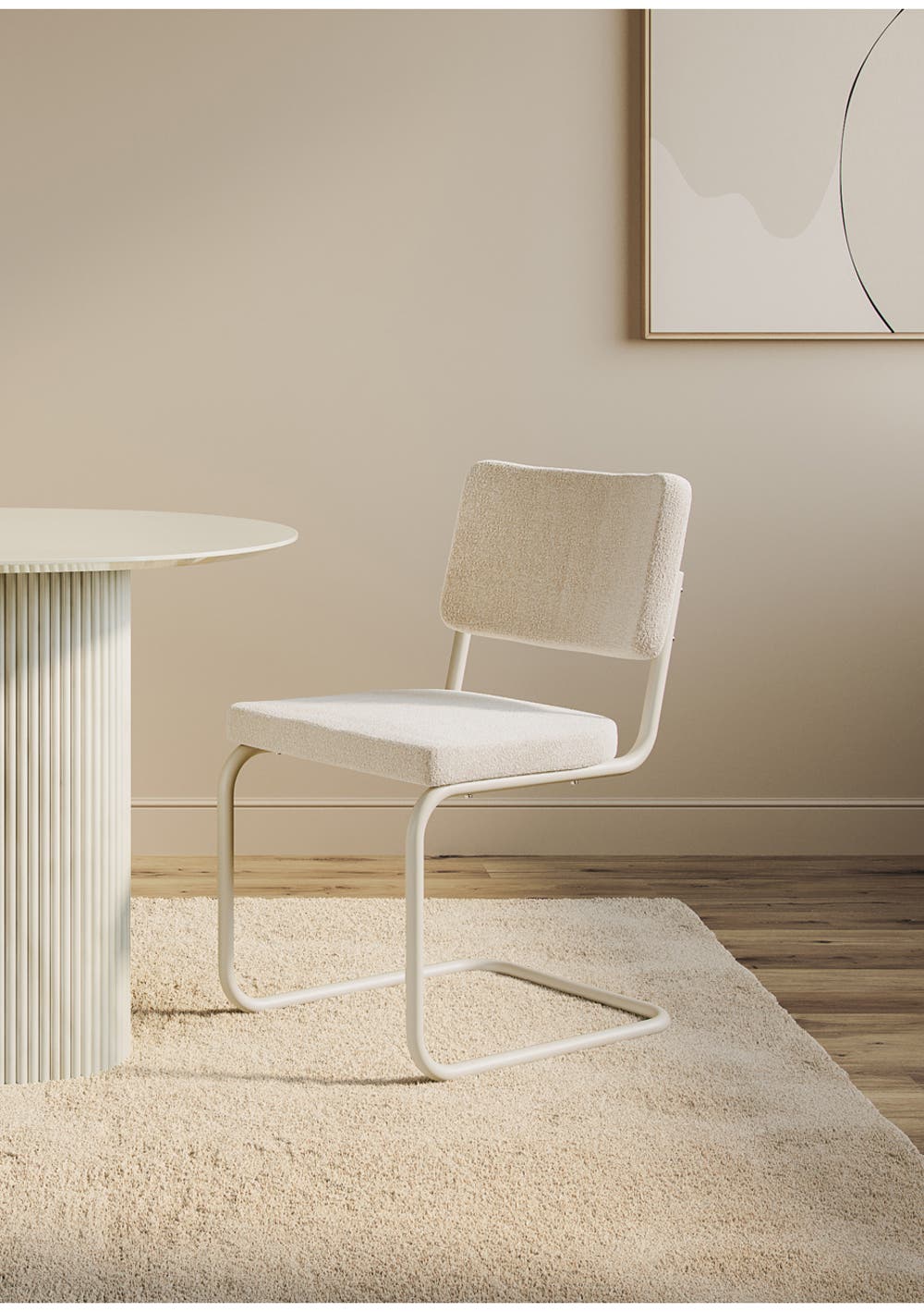 The seat and back are upholstered in a soft boucle fabric complemented by white metal legs for an iconic minimalist look with simple lines. Light-colored boucle fabric with white metal feet makes for a timeless classic color scheme that works with many design styles.
