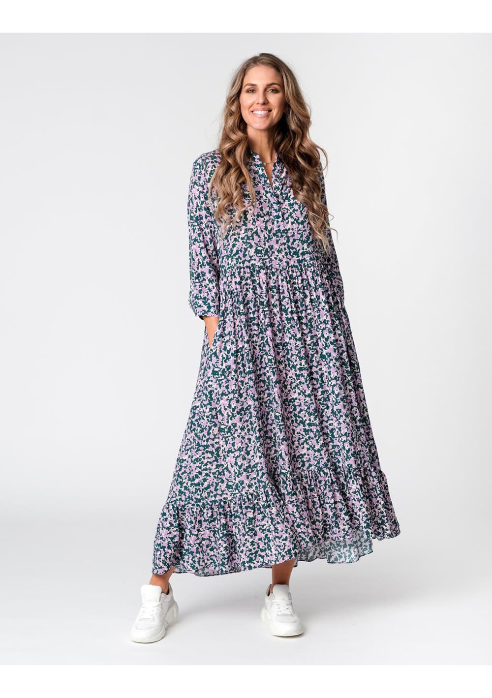 Relaxed fit maxi dress with hi-lo tiered hemline, slouchy slide pockets and button collar placket at neckline. Composition: 50% Viscose / 45% Rayon