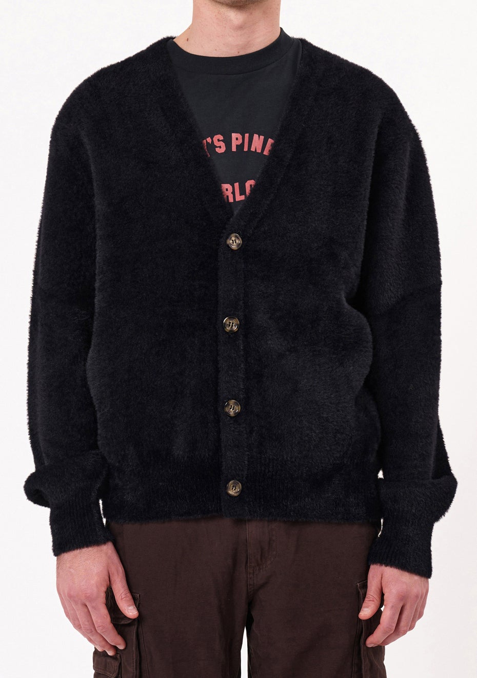 Relaxed fit Button down cardigan Features dropped shoulders as well as ribbed cuffs and hem Fuzzy nylon, acrylic blend yarn for a soft hand feel Made with 60% Nylon & 40% Acrylic