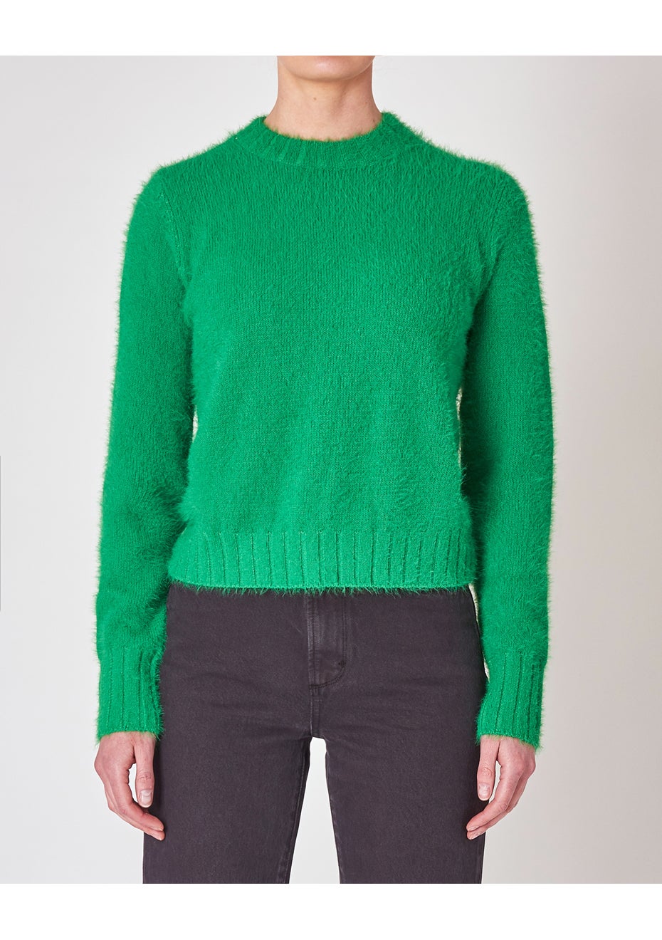 Fluffy feather yarn knit jumper Has a slightly cropped silhouette Ribbed neckline with matching hemline 50% Acrylic 50% Nylon