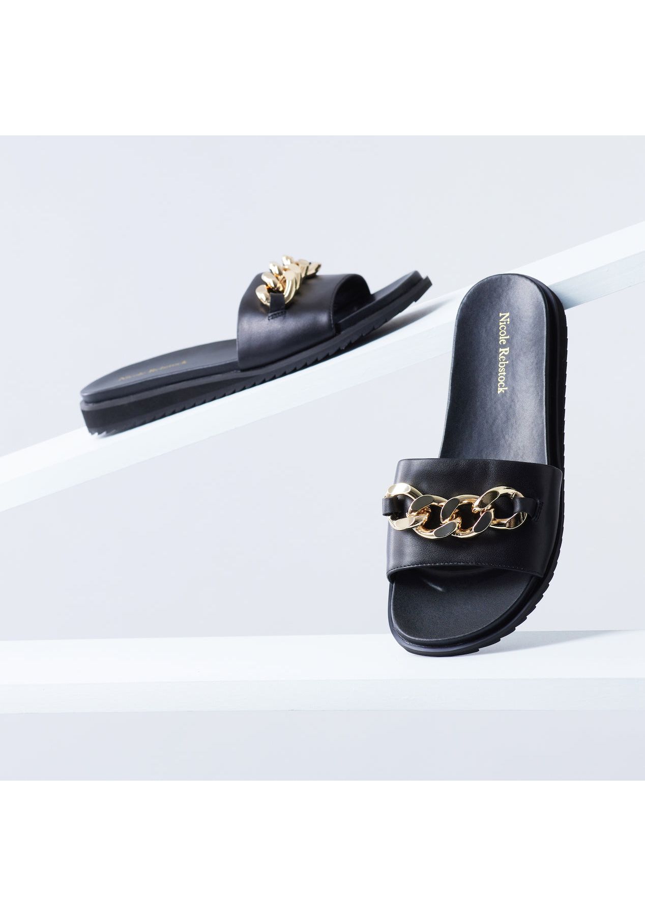 Style A high fashion, light weight, casual summer slide sandal with trending chain detailing and a sculpted sole. Leather upper & leather lining | Black leather with gold embellishments. Fit advice Width: average Length: small/average We recommend you choose your regular size. If you are in between sizes or have wide feet, choose your bigger size. Size guide Shipping & returns Care Visit one of our stores