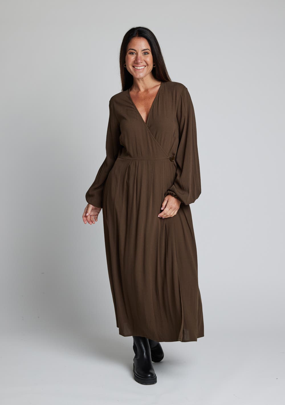 V Neck wrap maxi dress with waist button fastening and pleats and narrow width tie belt. 100% VISCOSE