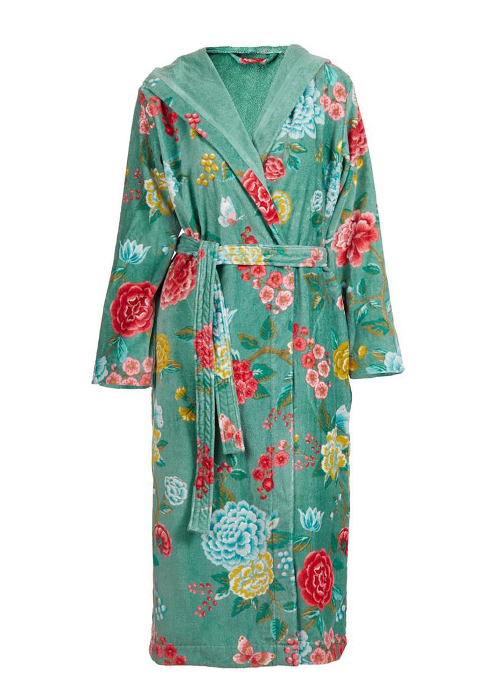 The Good Evening Bathrobe Green features a print of elegantly drawn oriental flowers. Butterflies flit between the flowers. The print includes the colours yellow, blue, green, pink, red, and white. The inside of the bathrobe is green.The Good Evening bathrobe is made from 100% high-quality cotton terry velour with a quality of 380 gr/m2. The robe feels super-soft, plump, and thick. It has excellent moisture-absorbing, breathable, and quick-drying qualities. The robe has a hood, pockets, and a long belt. The bathrobe can be washed at temperatures up to 60 degrees and is suitable for tumble drying.