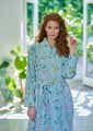 The Les Fleurs Bathrobe has a design of graceful flower sprigs with small decorated fantasy flowers. The inside of the bathrobe has a solid blue color. The bathrobe has a beautifully fitted quilted collar, side pockets and closes with a long belt. The Les Fleurs bathrobe is made of 100% high-quality cotton terry velor.