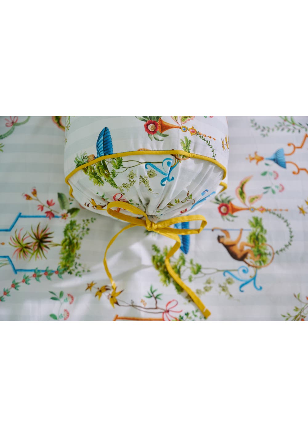 The Singerie bolster cushion has a cheerful design with decorative scenes featuring birds, monkeys, and a heron. A tonal stripe makes up the background of these scenes. This print was inspired by the singerie art genre that was popular in the South Netherlands during the Rococo. The decorative cushion has brightly coloured cord piping and a unique tie closure. The cushion is made of 100% percale cotton, 200 TC. Percale is a fine woven cotton of high quality. The cushion is 22 x 70 cm. The cushion can be washed at temperatures up to 60 degrees, is suitable for tumble drying, and can be ironed.