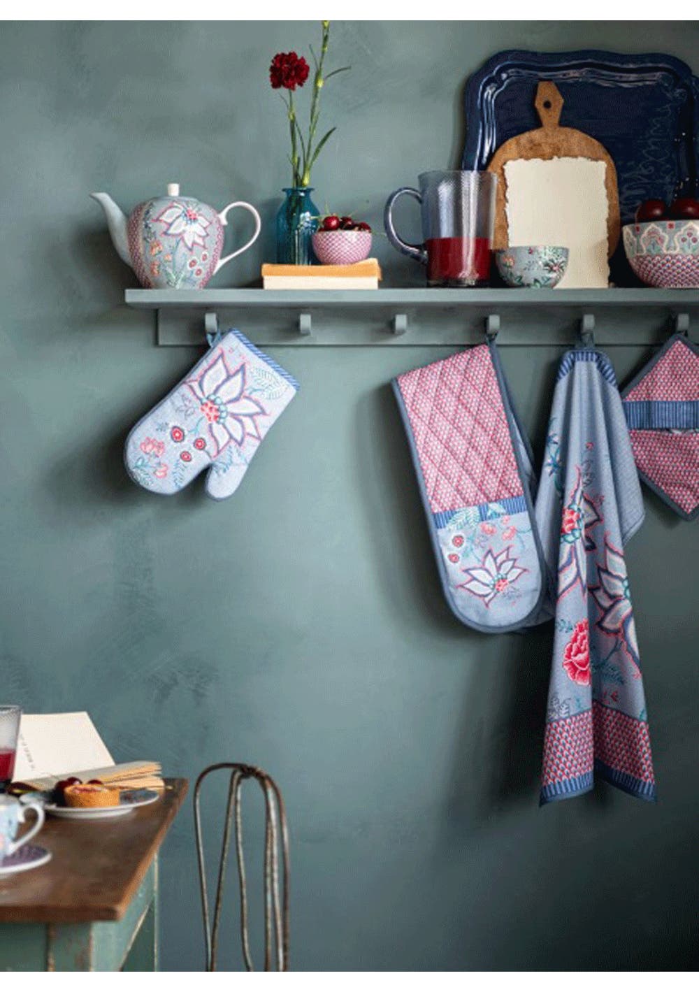 Add this Flower Festival oven mitt to your kitchen textile collection. The oven mitt has a blue background and is decorated with the elegant Flower Festival design. This rich floral pattern features a variety of fanciful red and pink chintz flowers with light blue and green leaves. The playfully positioned flower branches with elaborately decorated flowers and leaves give this elegant design an extra luxurious look and feel.