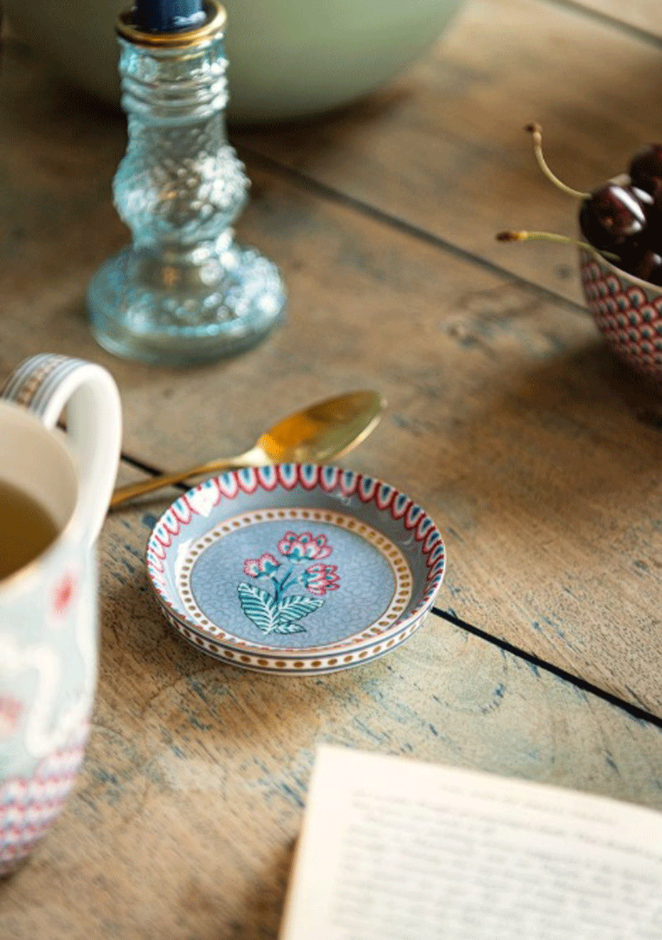 Add this Flower Festival tea tip to your porcelain collection. The tea tip has a blue background and is decorated with the elegant Flower Festival design. This rich floral pattern features a variety of fanciful red and pink chintz flowers with light blue and green leaves. The playfully positioned flower branches with elaborately decorated flowers and leaves give this elegant design an extra luxurious look and feel. Our Flower Festival porcelain will make your china cabinet and table shine.
