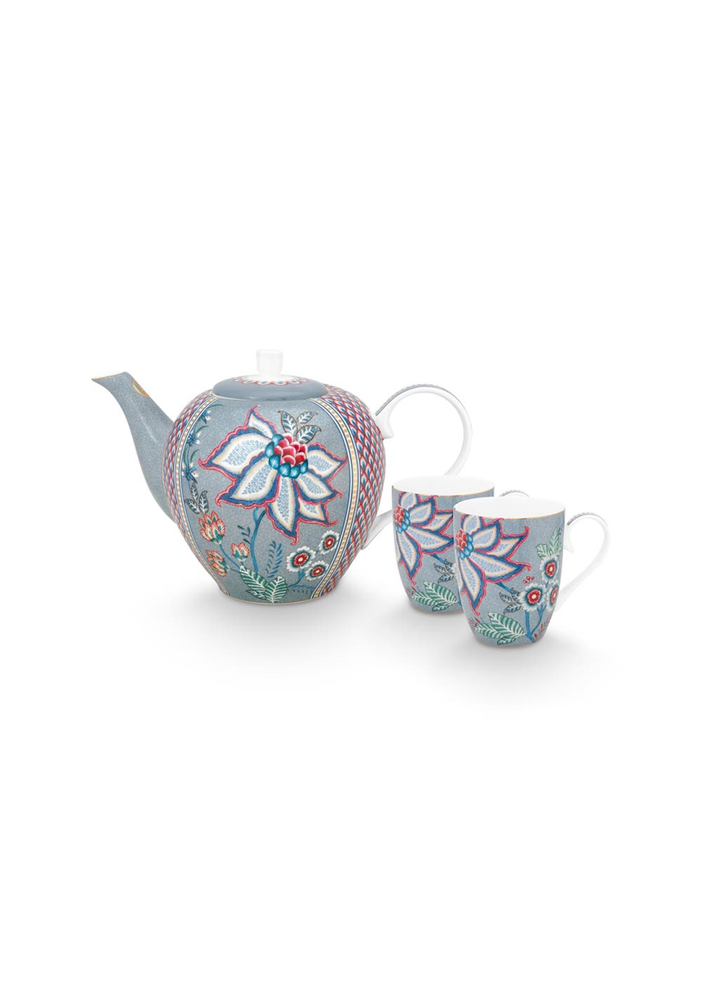 Add this Flower Festival tea set to your porcelain collection. The tea set has a blue background and is decorated with the elegant Flower Festival design. This rich floral pattern features a variety of fanciful red and pink chintz flowers with light blue and green leaves. The playfully positioned flower branches with elaborately decorated flowers and leaves give this elegant design an extra luxurious look and feel. Our Flower Festival porcelain will make your china cabinet and table shine.