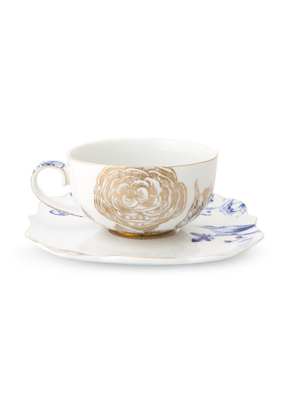 This cup and saucer with the Royal design is part of the Royal service. Royal is refined porcelain with elements of historical tableware, vintage flowers, blue painted blossoms and branches and golden details.