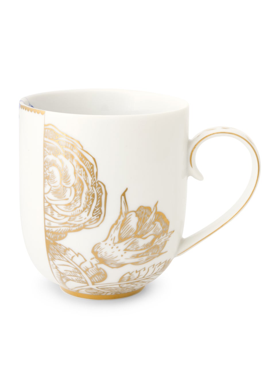 The mug with the Royal White design is part of our Royal White porcelain set. Royal White is refined porcelain with subtle blue painted features and golden elements.