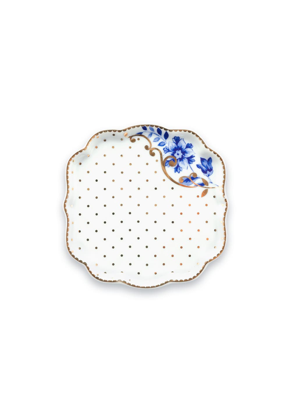 The teabag dish with the Royal White design is part of our Royal White porcelain set. Royal White is refined porcelain with subtle blue painted features and golden elements.