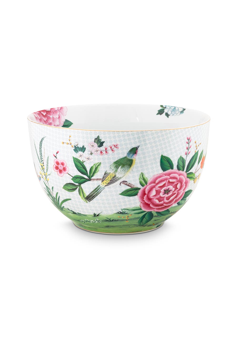 This large khaki bowl is decorated all around with exotic flowers and birds, golden details and a butterfly. The background has an elegant print and elements from the design adorn the inside of the bowl. Combines beautifully with the other porcelain sets in the Blushing Birds collection. Diameter: 23 cm, Golden details, Made of delicate porcelain. 23cm Diameter 23cm Diameter
