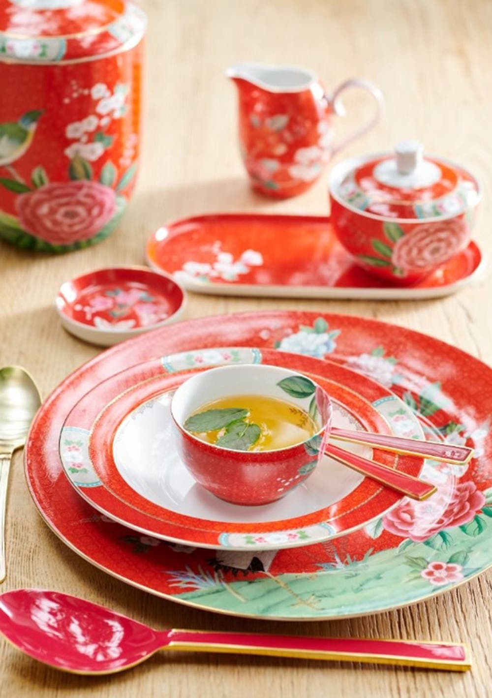 This colourful bowl is decorated all around with exotic flowers, a bird and golden details. The background has an elegant print. The large pink flower extends slightly over the edge and elements from the design adorn the inside of the bowl. Combines beautifully with the other porcelain sets in the Blushing Birds collection. Diameter: 12 cm, Golden details, Made of delicate porcelain
