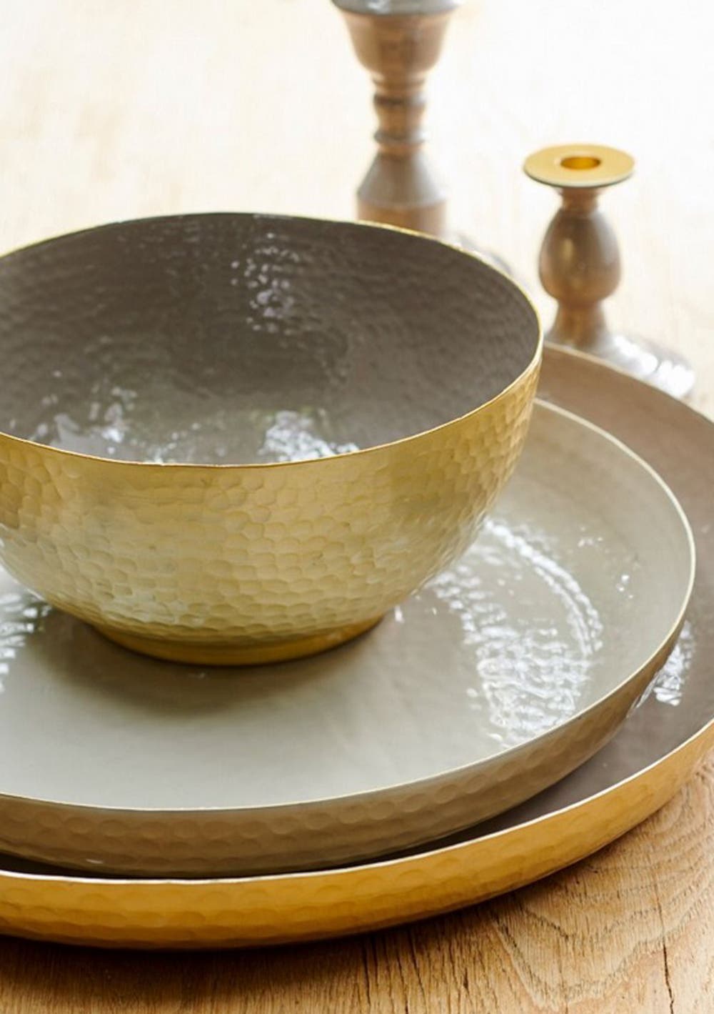This khaki tray with golden bottom can be placed on a table and filled with accessories. Diameter: 50 cm. 50cm diameter