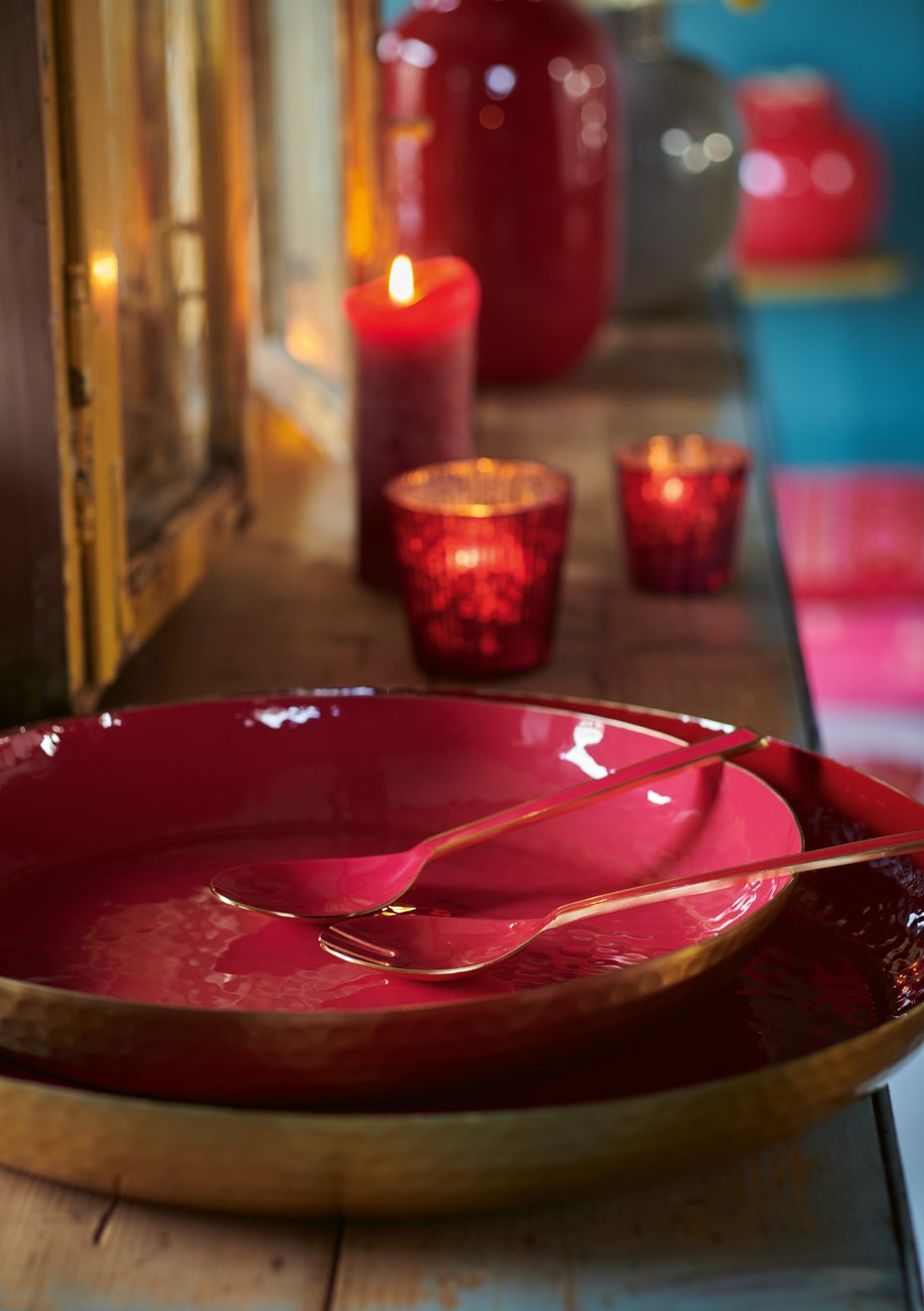 This red tray with golden bottom can be placed on a table and filled with accessories. Diameter: 50 cm.