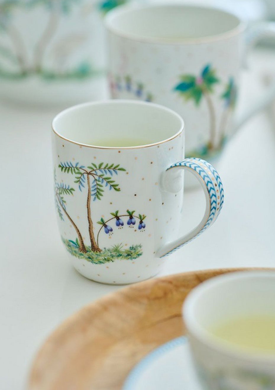 A mug from our tropical Jolie collection. This beautiful mug has a white background with golden dots. Imagine yourself on a tropical island and have a look at the palms and tropical plants, decorated on this mug. Perfect to brighten up your tableware. The handle of the mug is decorated with elegant blue details. This mug is also available in a large version which is perfect to combine together for a playfull effect on your table.