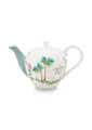 This tropical small teapot with a white background will take you on a trip to a treasured island. The teapot is decorated with unique tropical plants and flowers. Such as palmtrees and various colorful fresh fruits. Furthermore you will discover an exotic heron combined with lovely pressed flowers and golden dots. The spout has a sky blue color which suits perfectly with the tropical vibes.